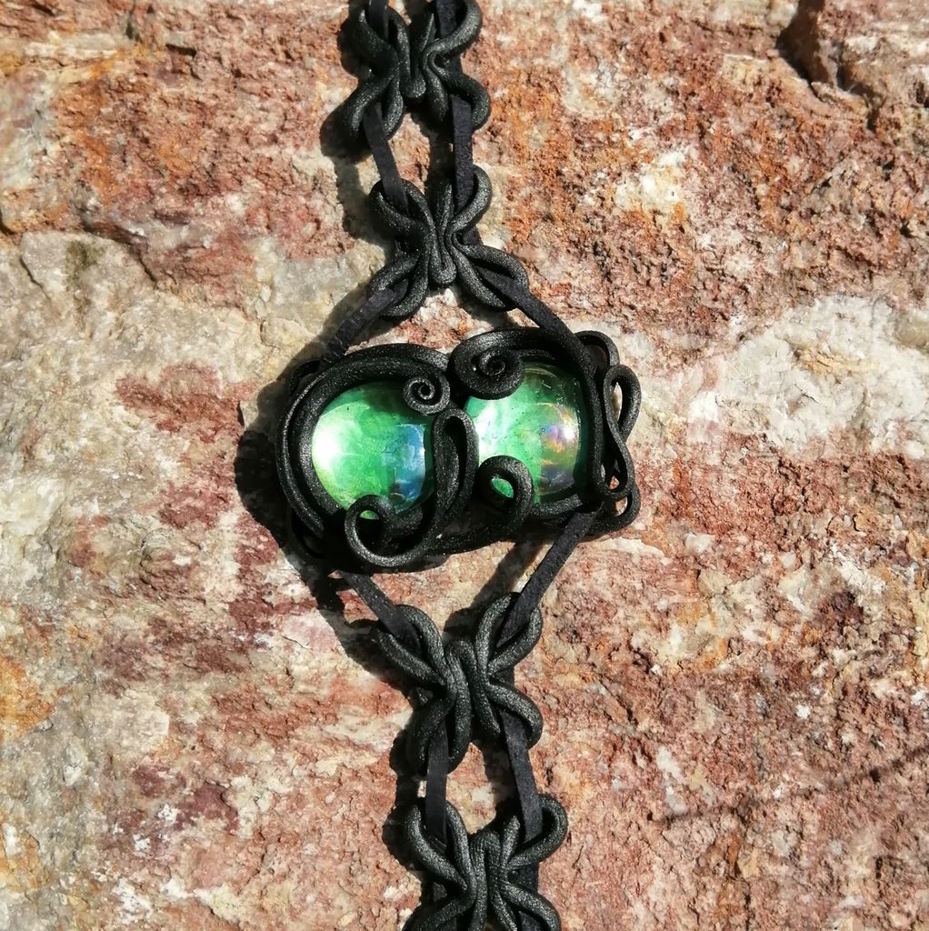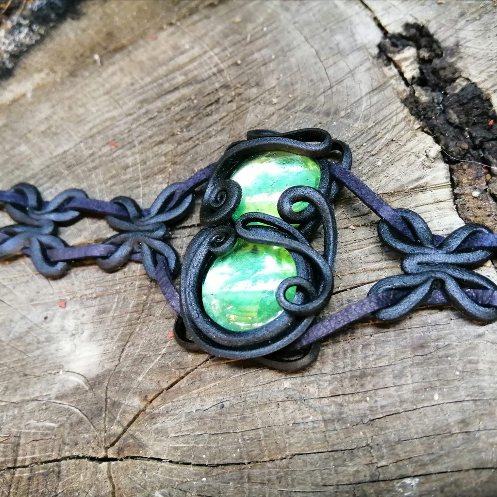 Originální šperk, který se uváže koženými šňůrkami na krk či na ruku. Ve středu jsou dvě světlemodrá skla v umělecké pryskyřici.