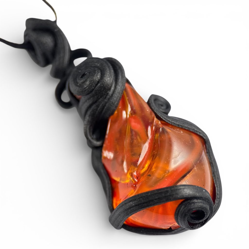 Skleněný závěs na krk v umělecké pryskyřici, ve slunečním světle se zdá jako by v něm tančil malý plamínek.