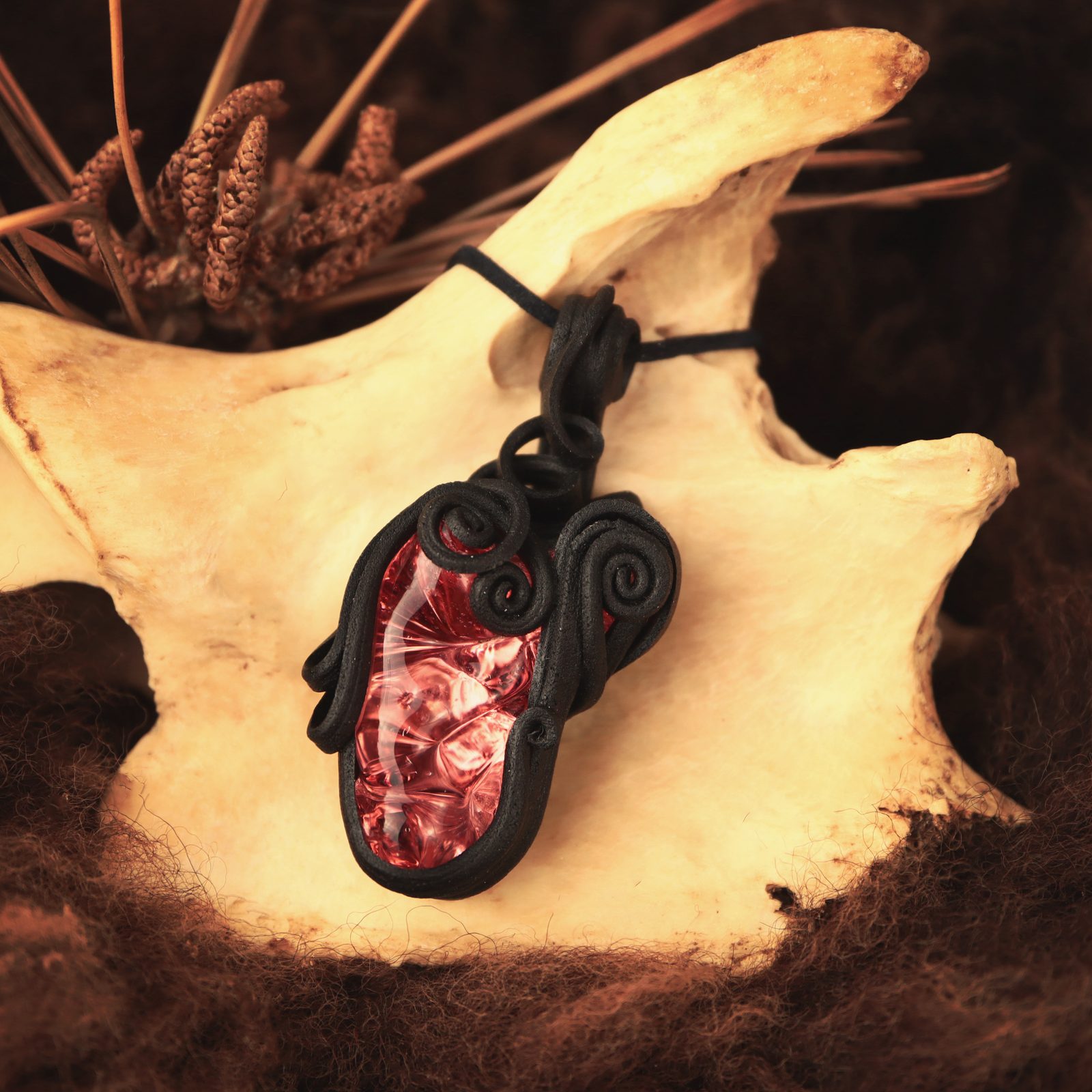 Skleněný přívěšek v umělecké pryskyřici. Kožený řemínek v ceně. Každý kus je originální a může se lišit tvarem a barvou.