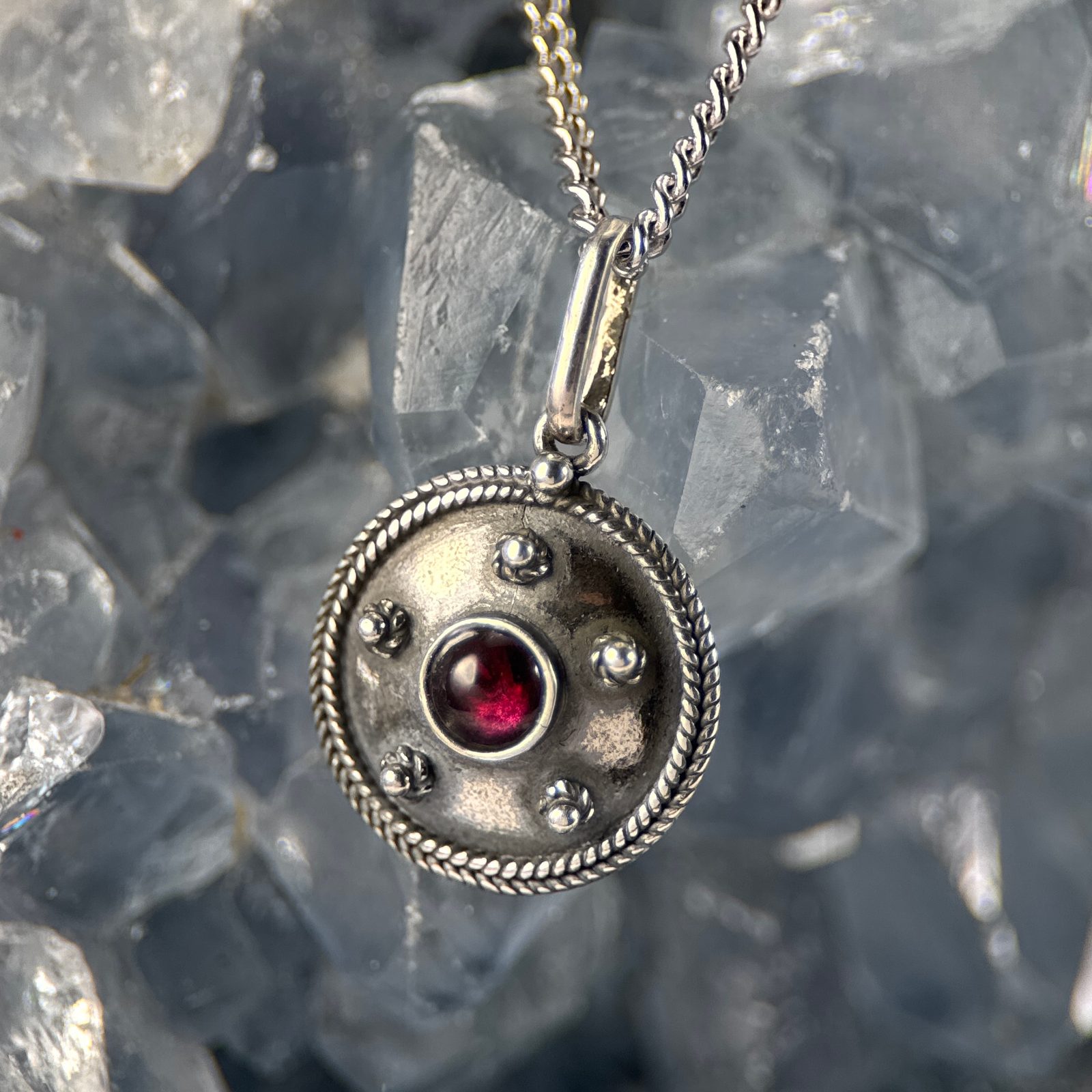 Stříbrný přívěšek se vsazeným kamenem. Možnost Vaší volby kamene, na fotografii almandin. Inspirován římskými šperky.