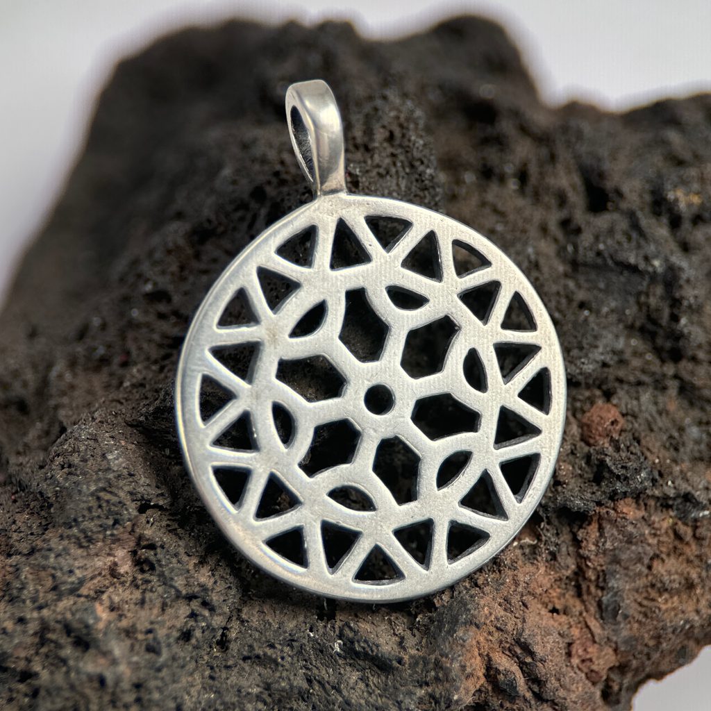 Volná inspirace motivem z výzdoby jehlice z doby bronzové (mladší doby bronzové) z let 1300-1000 p.n.l. Jehlice byla nalezena v Bušovicích v okrese Rokycany.