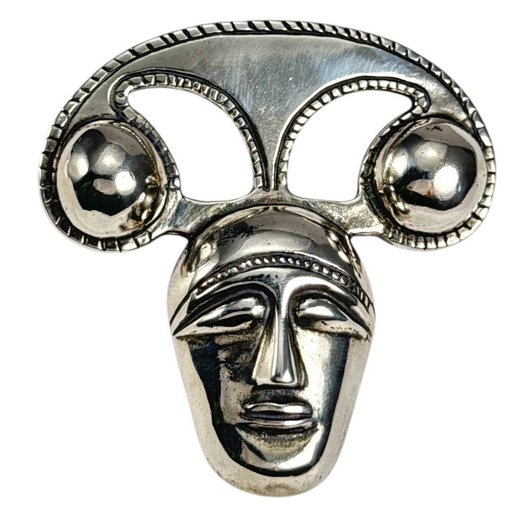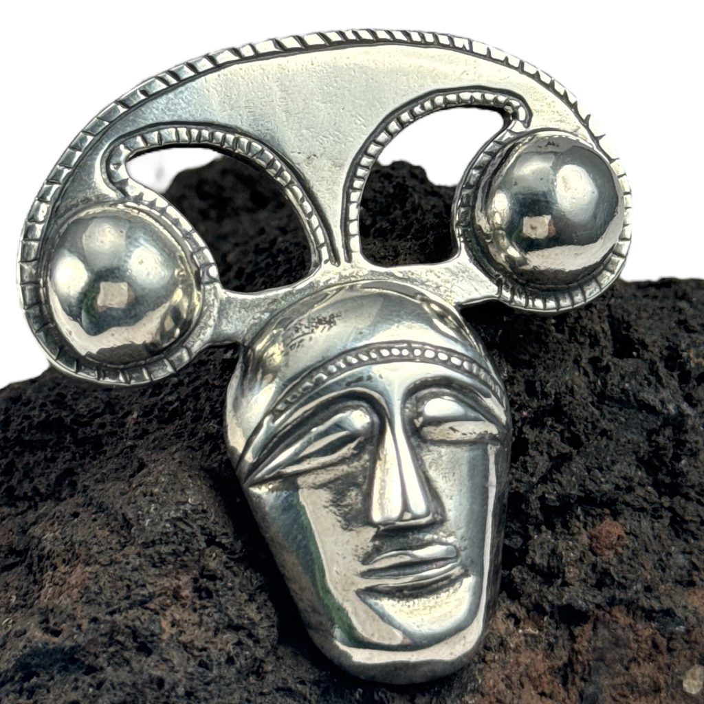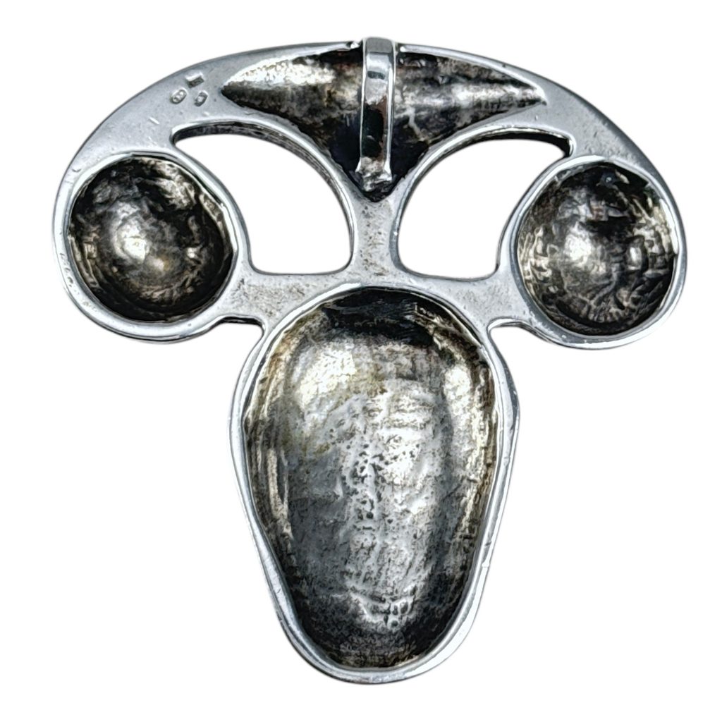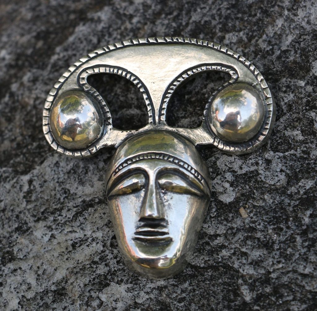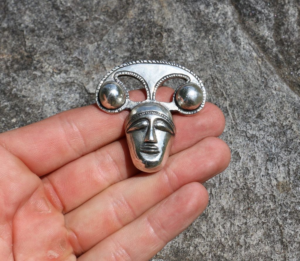 Vyjímečně velká stříbrná keltská hlava v laténském stylu s uchem na průvlek z druhé strany. Lze ji použít jako extravagantní módní doplněk či jako honosný šperk (v kombinaci třeba se skleněnými vinutkami) pro druida či válečníka. Originál: Aylesford konvice, 1. století Starého věku.