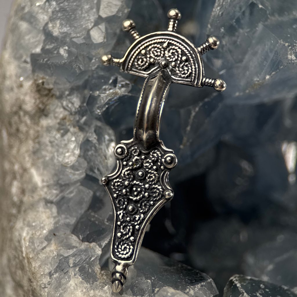 Raně středověká mostová spona. Tyto šperky byly velmi hojné napříč Evropou a vypovídaly cosi o společenském postavení majitele. Jejich provedení bývala až neskutečně složitá a často se používaly i různé vitráže. Model pro náš šperk jel vytvořen pravou granulací a filigránem a jedná se o šperk pro dámy i pány.
