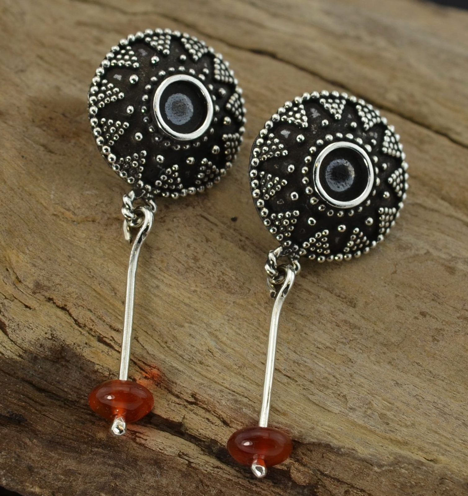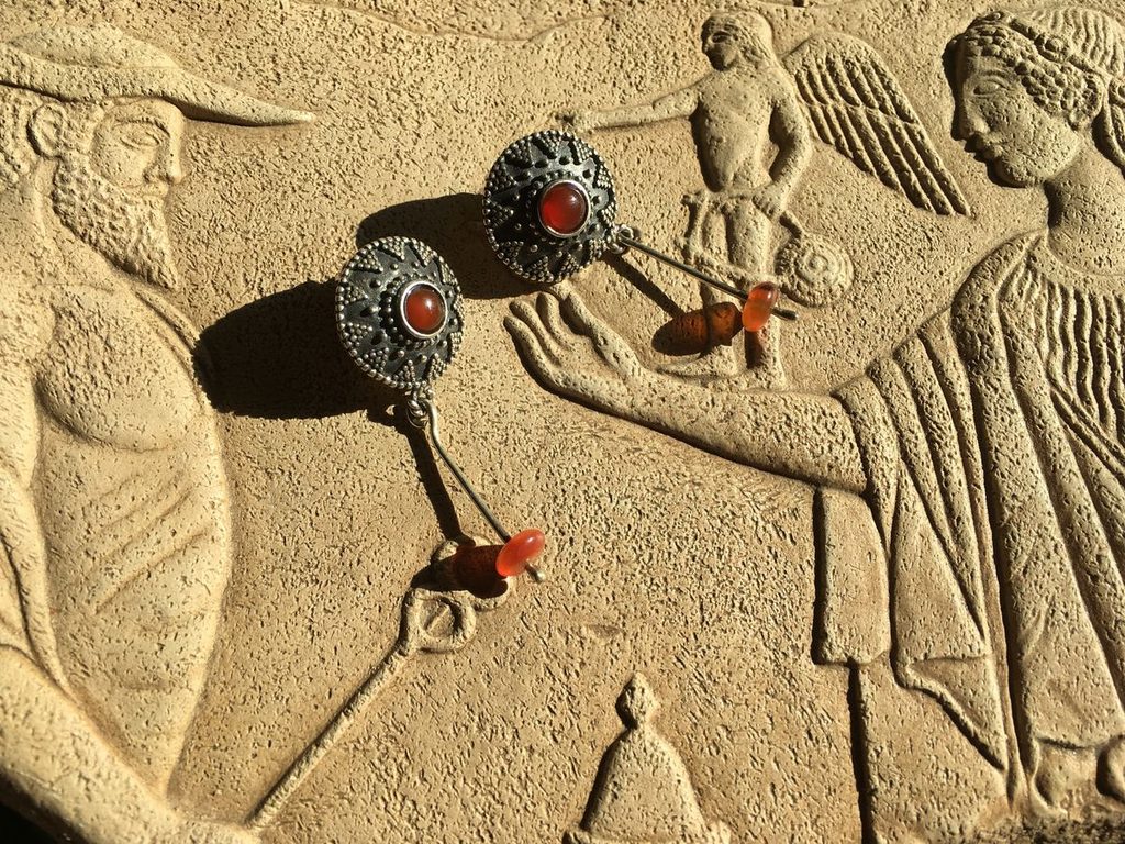 Repliky stříbrných římských náušnic s karneolem (polodrahokam). Stáří originálu: 2. - 3. století. Na Vaše přání do náušnic zadadíme oranžový až medový hesonit (odrůda granátu), který často používali Římané a Indové, protože věřili, že odvrací zlo.
