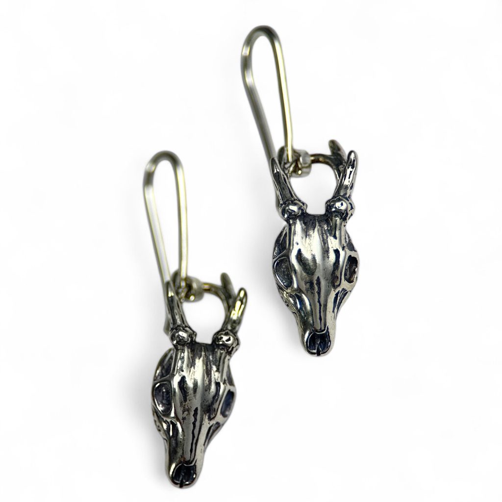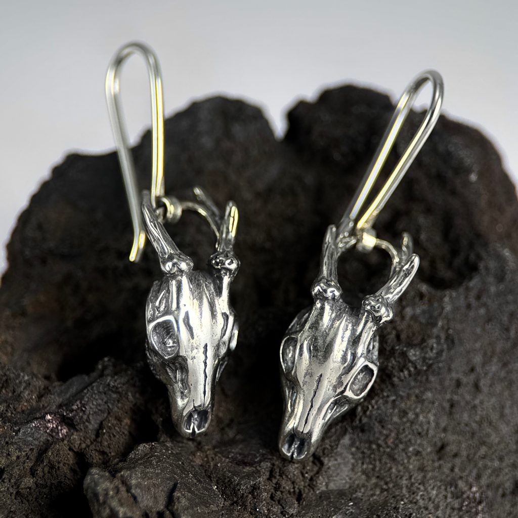 Šamanské stříbrné náušnice s lebkou jelena pro šamanky.