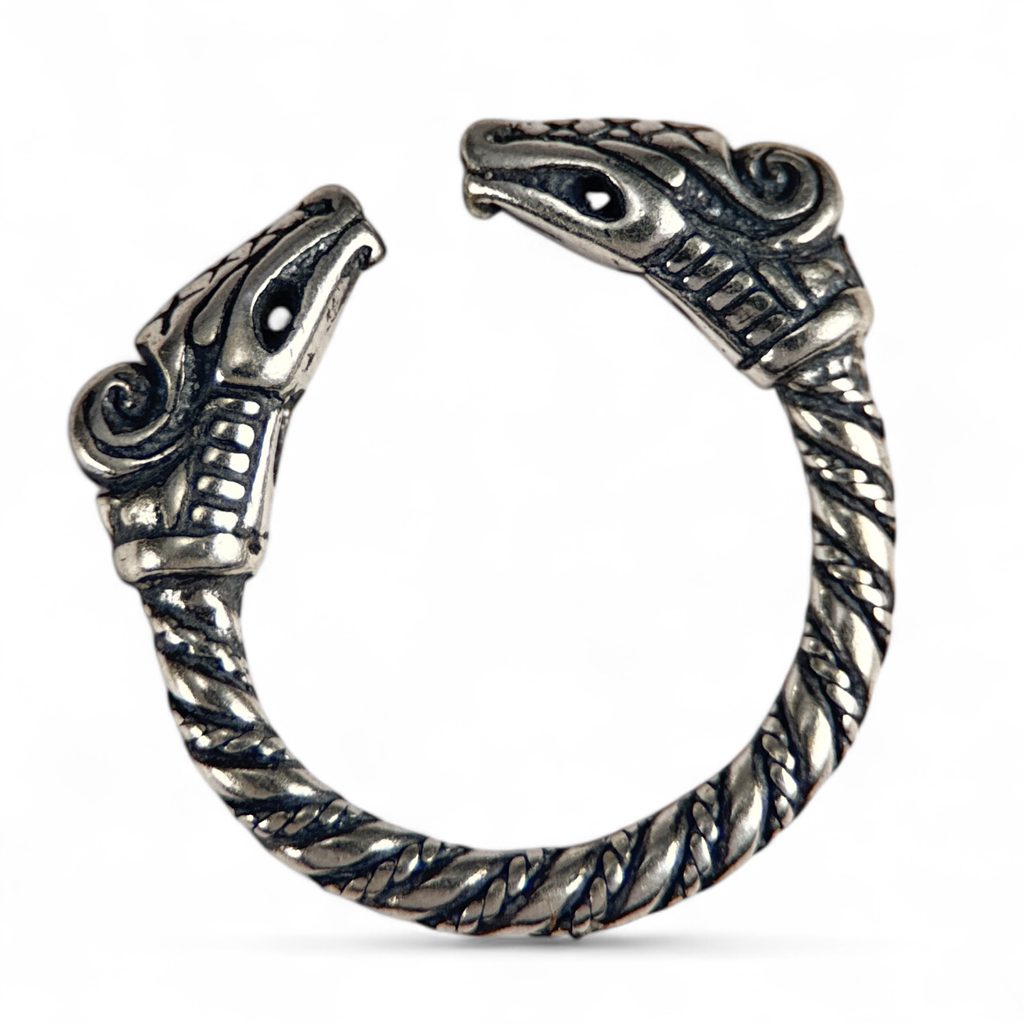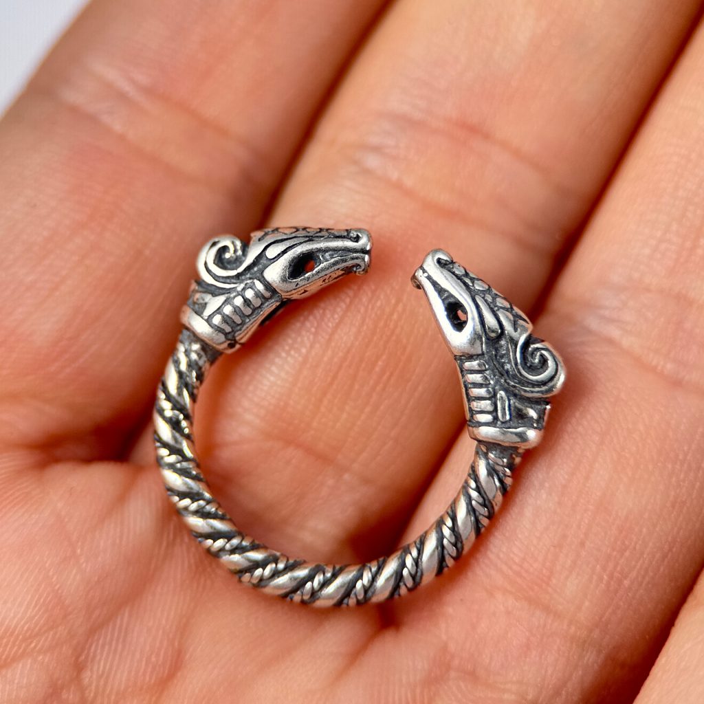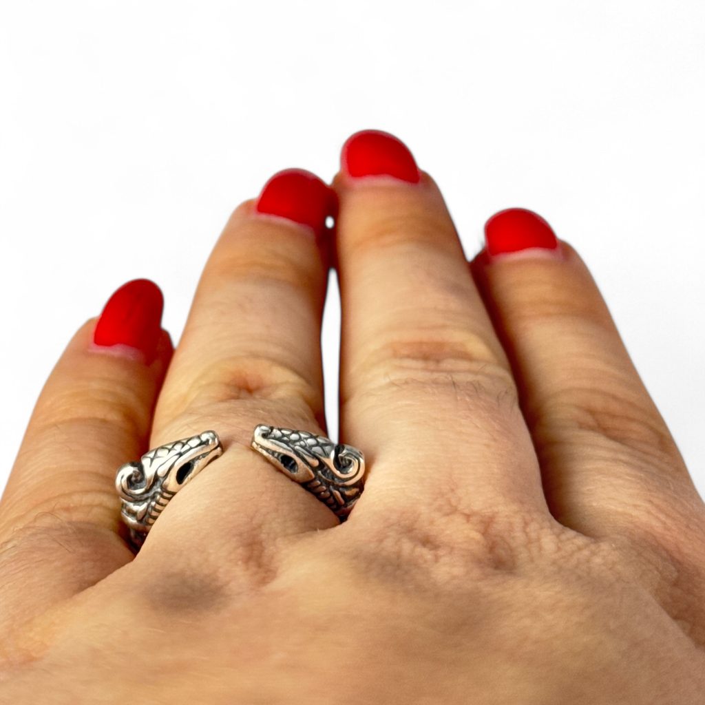 Dreki - vikinský drak, stříbrný prsten. Design vychází z draků stylu Jellinge. V podobném duchu byly zobrazovány na runových kamenech, brožích a vyřezávaných dřevěných předmětech.