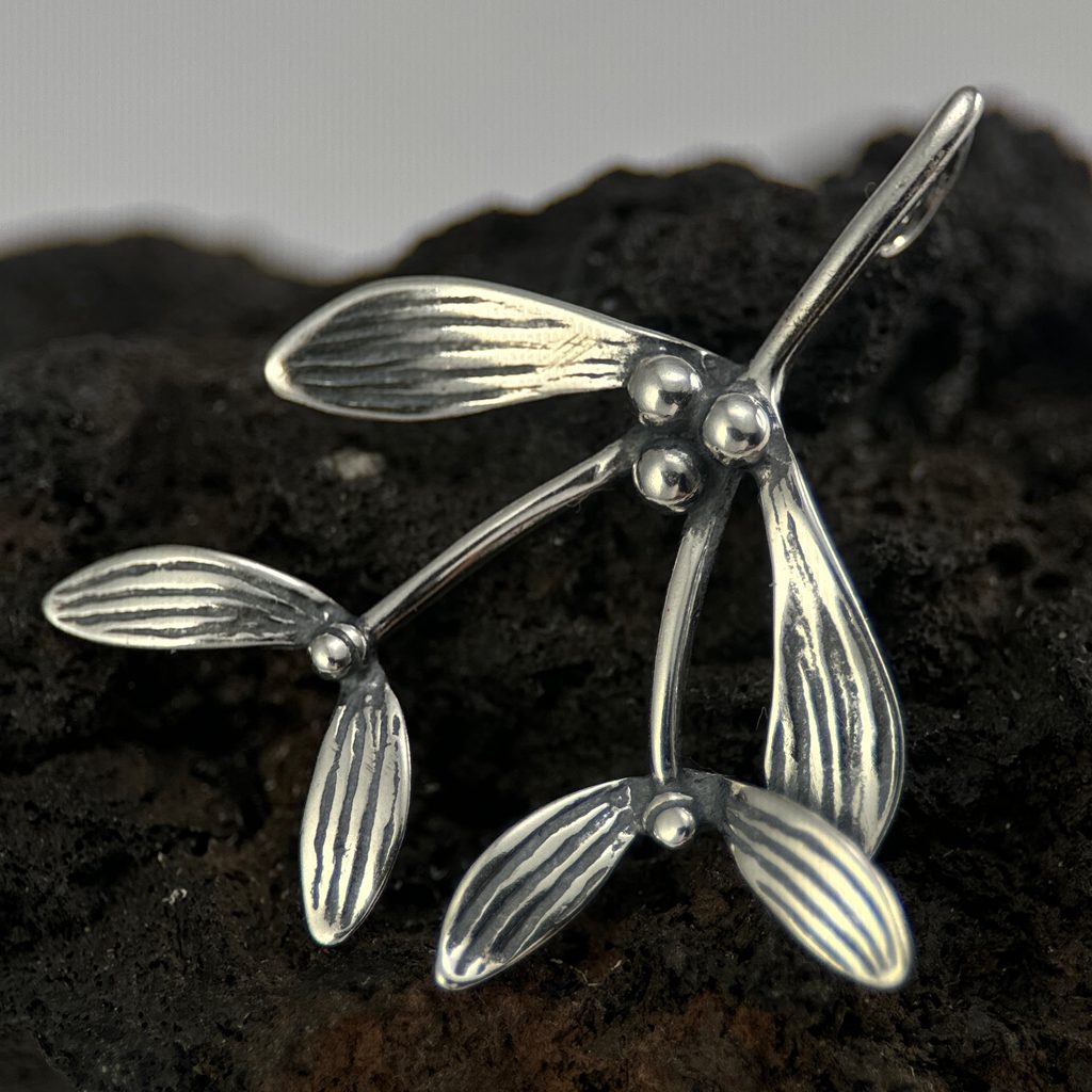 Stříbrný přívěšek - druidské jmelí. Z římských pramenů (Plinius) víme, že druidové osekávali z posvátného dubu zlatým srpem jmelí, jenž zachytávali do bílého pláště. Takto získané jmelí přidané do nápoje údajně léčilo neplodnost.