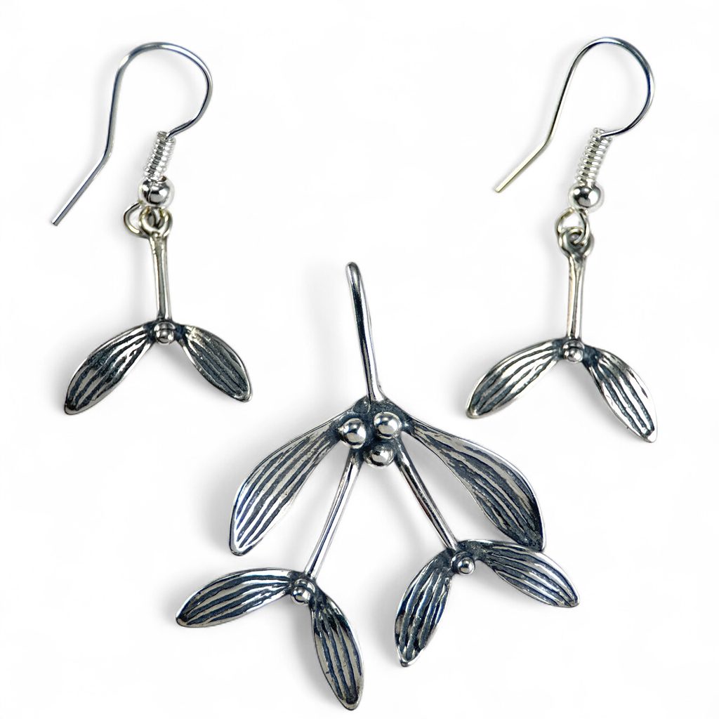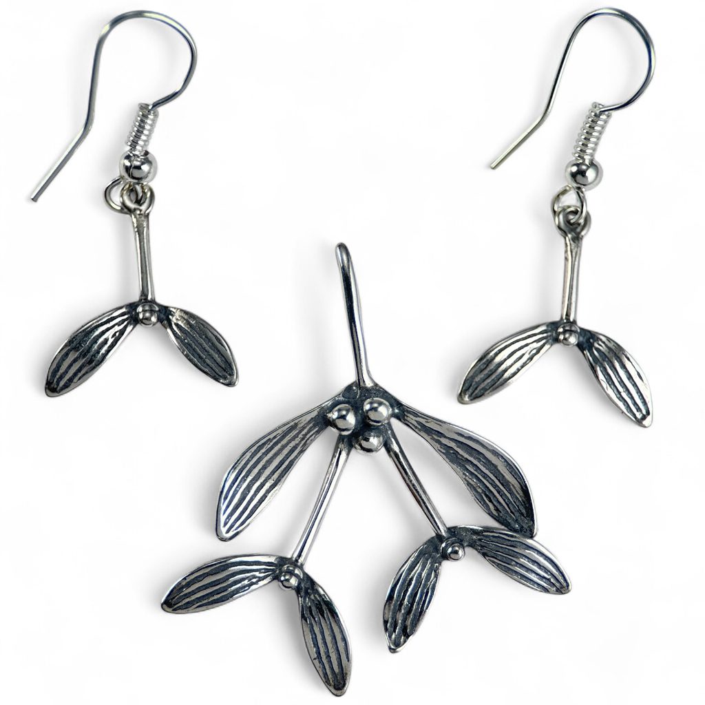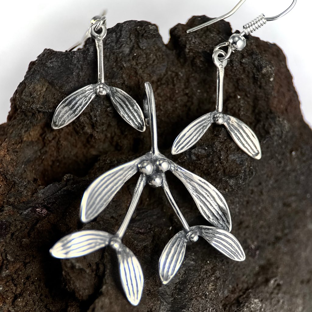 Stříbrné náušnice a přívěšek - druidské jmelí. Z římských pramenů (Plinius) víme, že druidové osekávali jmelí z posvátného dubu zlatým srpem a zachytávali je do bílého pláště. Takto získané jmelí přidané do nápoje údajně léčilo neplodnost.