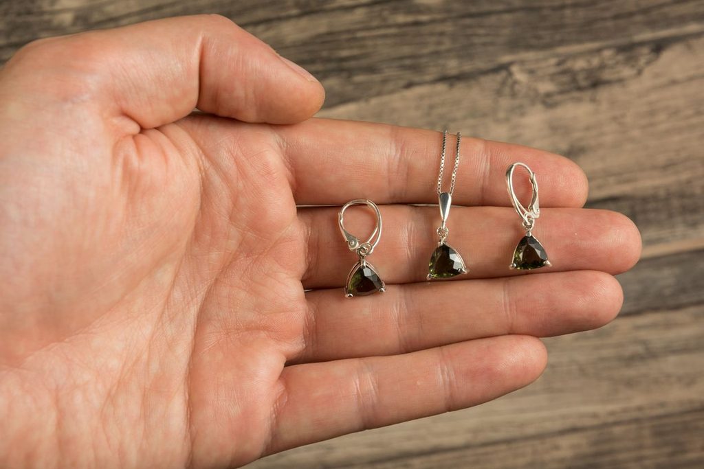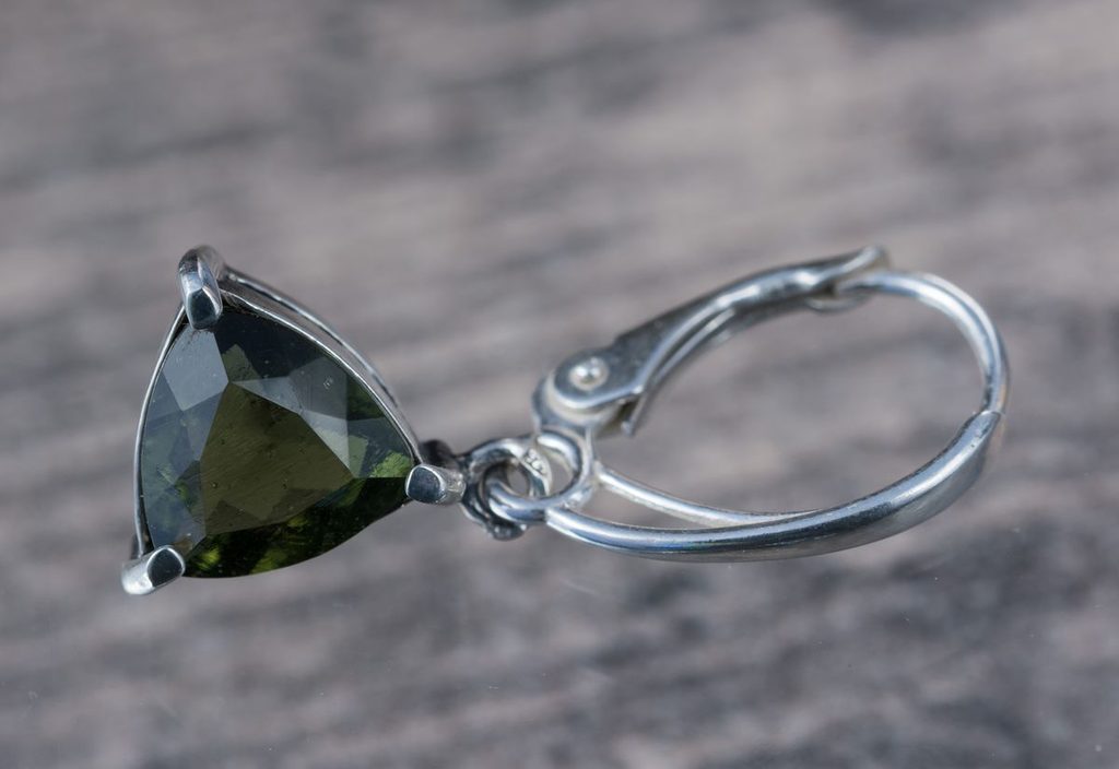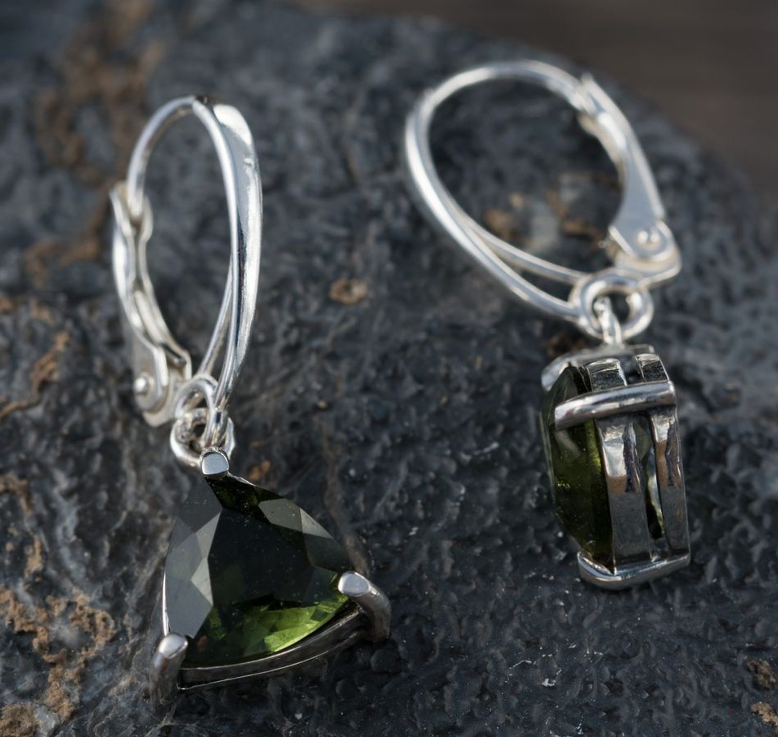 Stříbrné náušnice s broušeným českým vltavínem. Šperk je kompletně naší produkce, vltavíny necháváme brousit na Turnovsku.