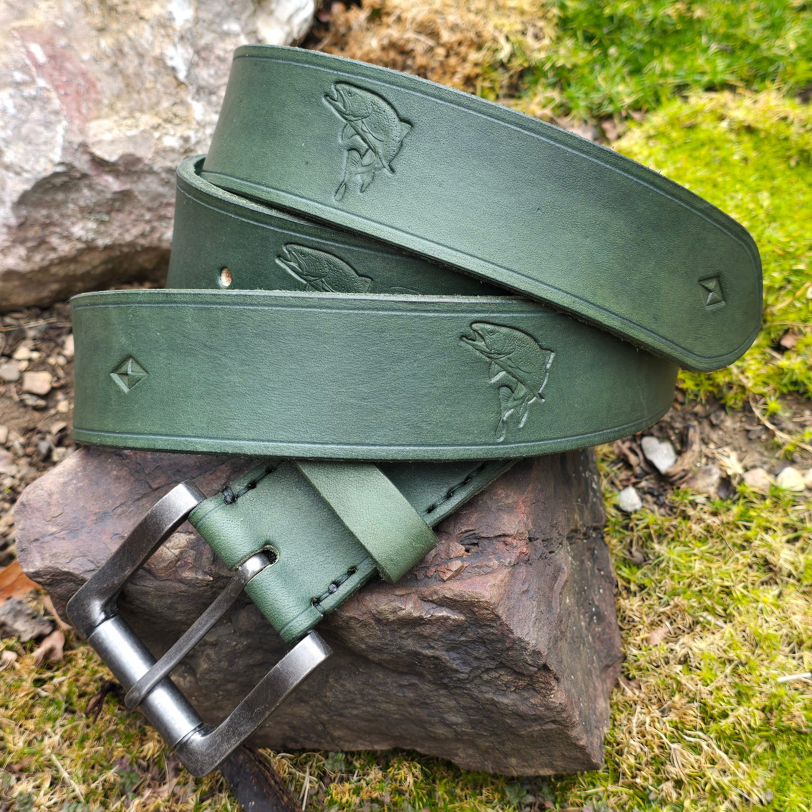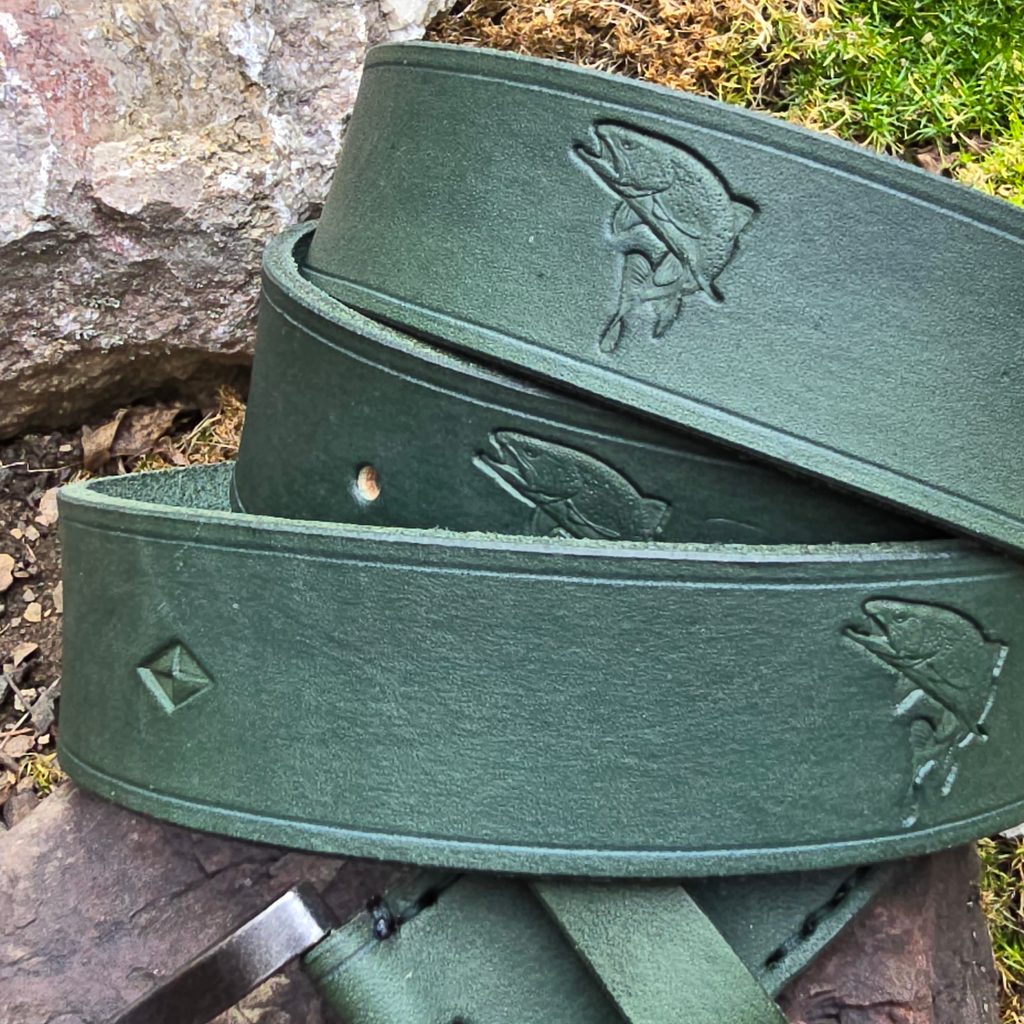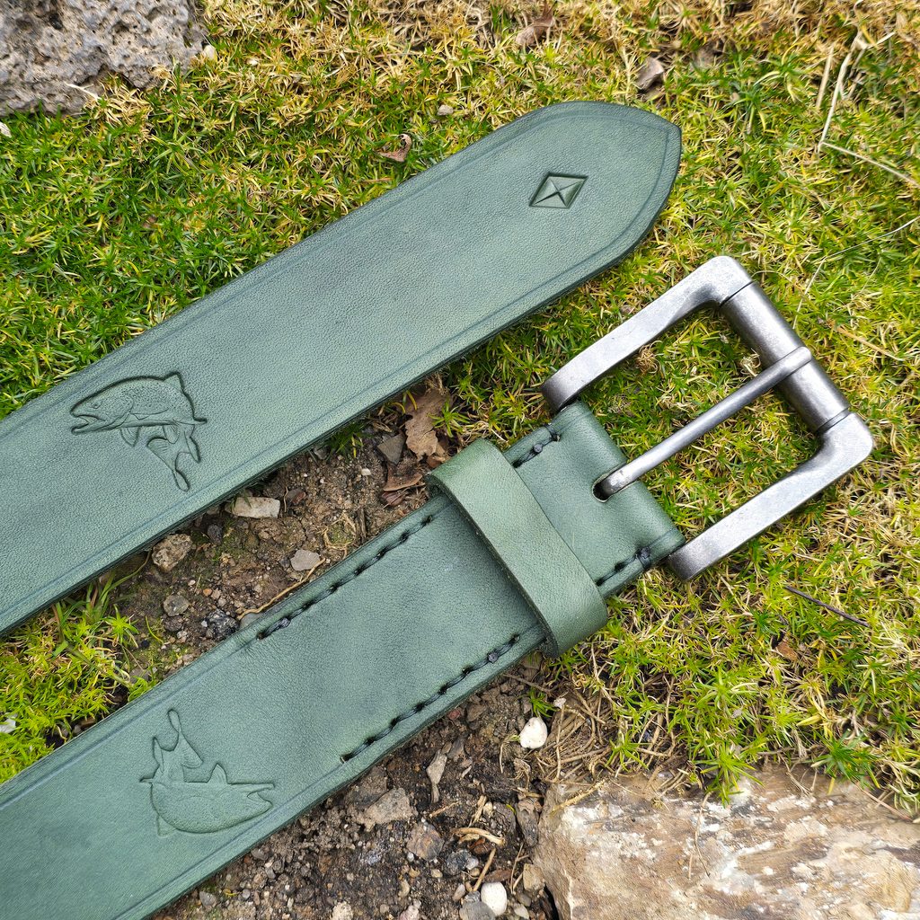 Přinášíme Vám kvalitní kožený rybářský opasek s vyraženým motivem ryby - pstruha. Opasek je ručně ozdoben razidly a vyroben z prvotřídní kvalitní hovězí usně. Je nejenom funkční záležitostí, ale i zajímavým dárkem pro všechny rybáře. Opasek nabízíme v několika délkách a na speciální přání lze na opasek i vyrazit i iniciály.