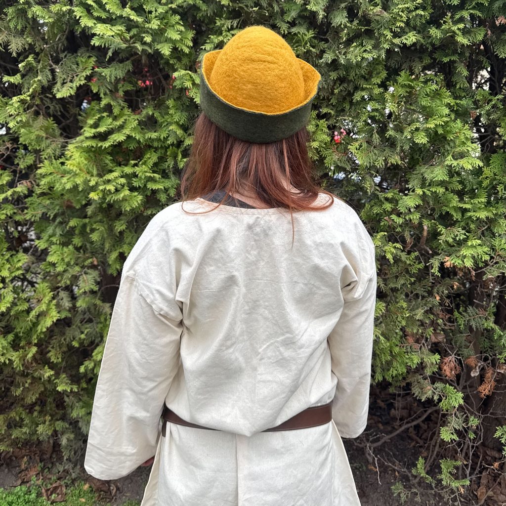 Tato středověká čepice je vyrobena ručním plstěním ze 100% ovčího rouna. Podobné pokrývky chrání hlavu proti chladu a dešti a mají ozdobnou funkci. Čepice je vyrobena z jednoho kusu a nemá švy, což je výhoda - neuniká tolik tepla a voda neprotéká dovnitř.