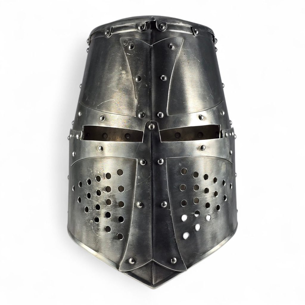 Středověká přilba typu kbelc. replika inspirovaná ochrannou výzbrojí rytířů vrcholného středověku. Tento model je vyroben z lehkého hliníku, díky čemuž se pohodlně nosí a je snadno manipulovatelný i při delším použití. Přilba je určena zejména pro filmařské účely, tedy jako rekvizita pro divadelní a filmové inscenace. Není určena k šermířským bojům.