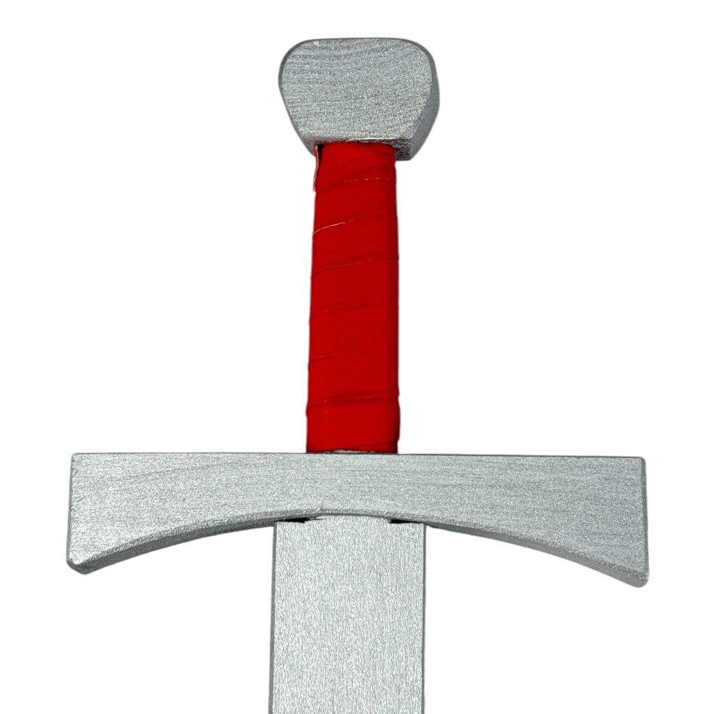 Středověký dětský meč o délce 65 cm se stříbrnou čepelí, záštitou a hlavicí. Rukojeť je pevně omotána červenou kůží nebo sametem pro pohodlný a jistý úchop. Meč je zdoben malým štítem s českým lvem – symbolem české hrdosti.