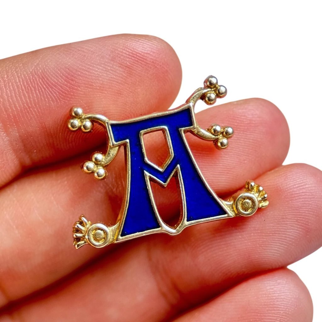 Replika středověké ozdoby ve tvaru písmene „A“, inspirovaná originálem z muzea v Baden-Badenu (Francie, 14. století). Ozdobená tmavě modrým studeným smaltem, určená pro opasek o šířce 20 mm.