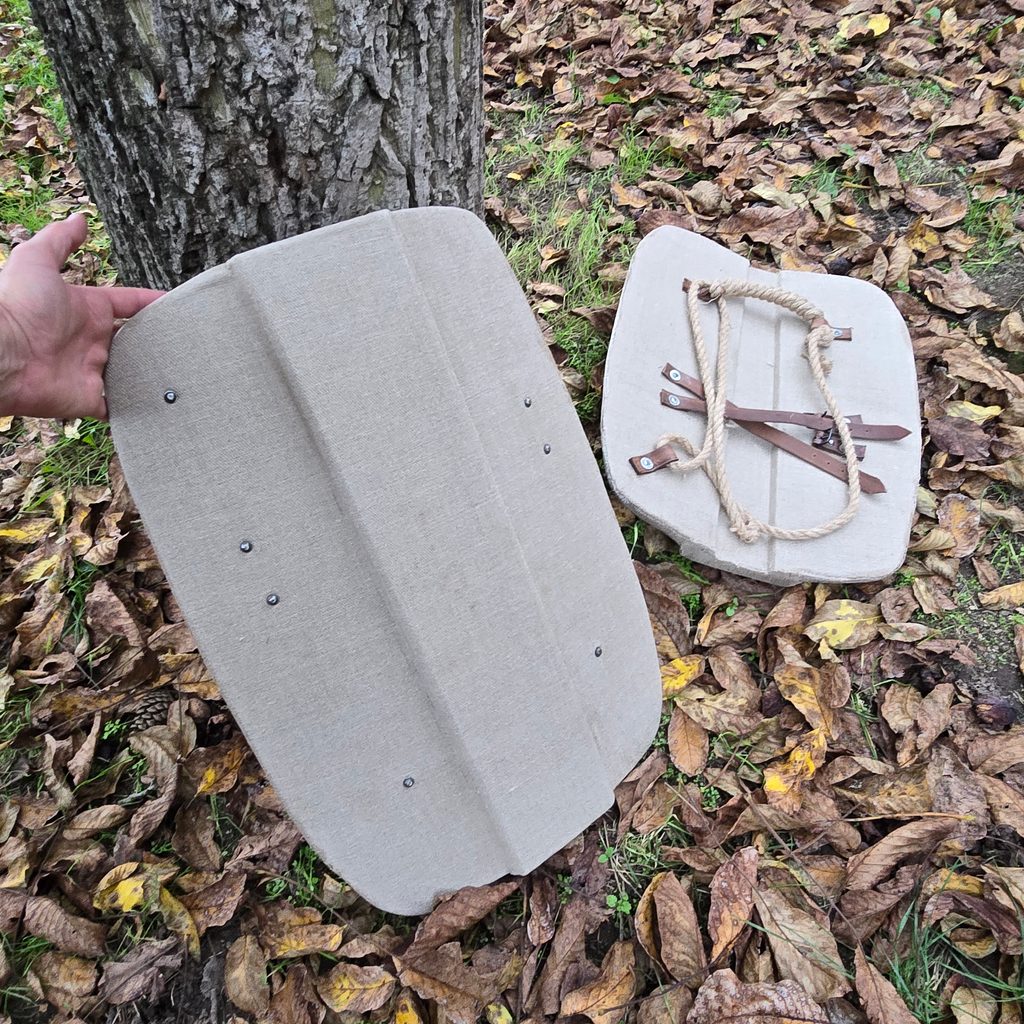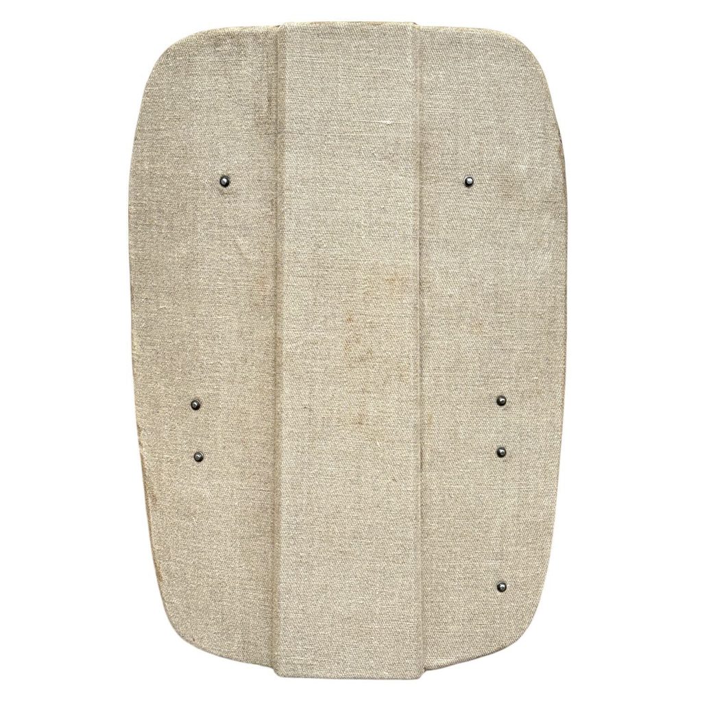 Tento středověký štít představuje věrnou historickou repliku obranného vybavení používaného v období vrcholného a pozdního středověku. Jeho rozměry, 60 × 45 cm, odpovídají menším typům pěchotních či jezdeckých štítů, které sloužily k ochraně těla při boji zblízka i na dálku. Konstrukce štítu je založena na dřevěném jádru, které je pro zvýšení pevnosti a odolnosti potaženo lněným plátnem. Tento materiál se ve středověku běžně používal, protože po napuštění klihem či pojivem vytvářel kompaktní a houževnatý povrch schopný odolávat úderům i průrazu.