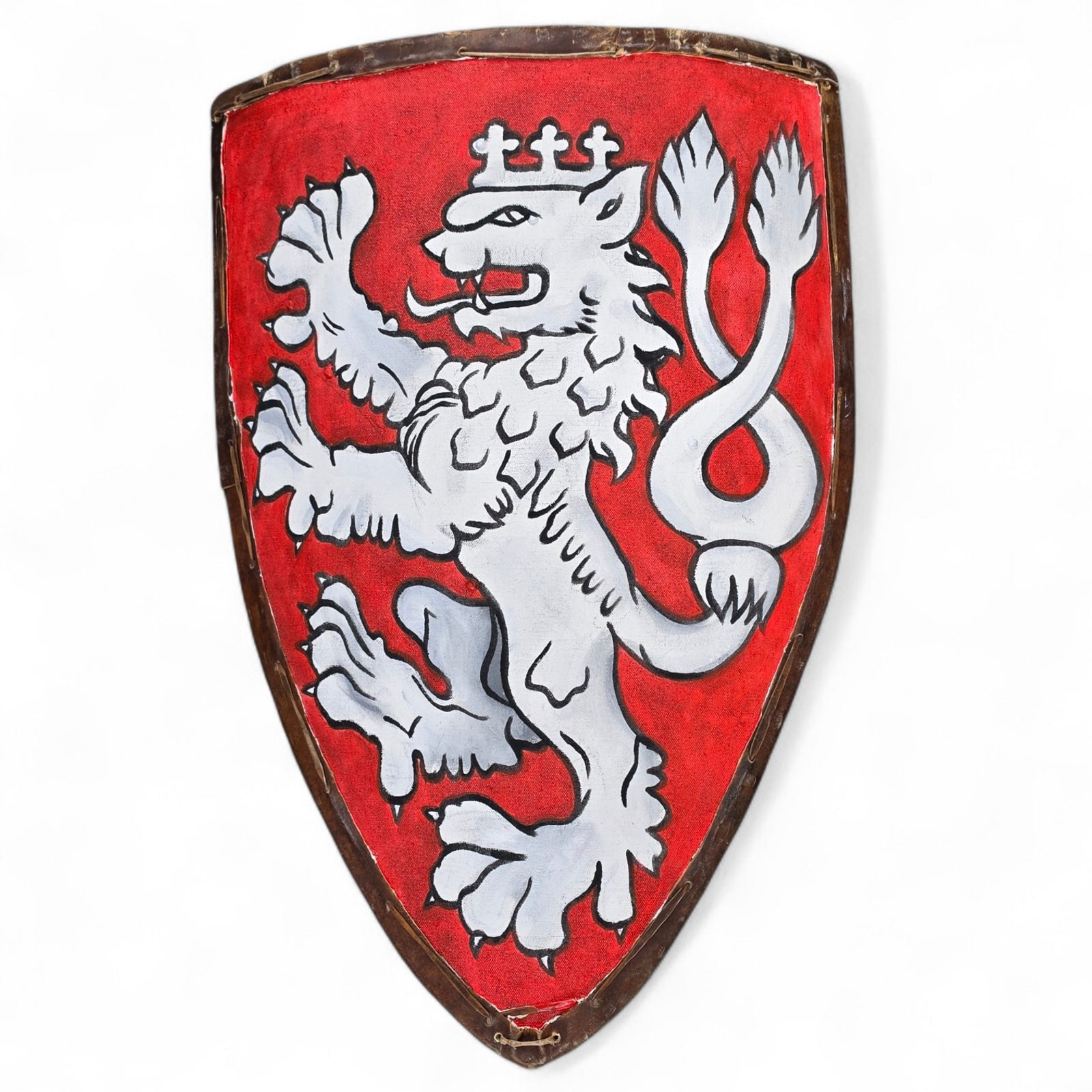 Gotický štít. Velikost: 60 x 80 cm. Vyrobeno ze tří kvalitních bukových překližek o síle 3 mm, tloušťka: 9-10 mm. Potaženo plátnem a olemováno surovou kůží.