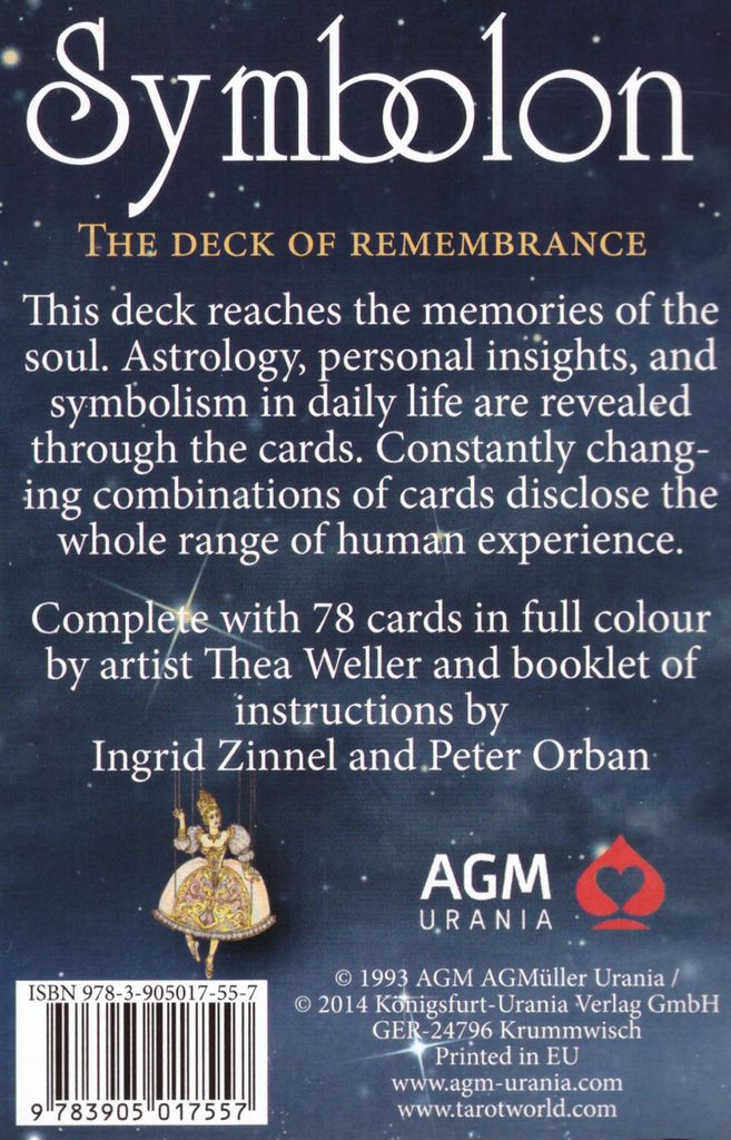 Balíček tarotových karet. Astrologie, osobní poznatky a symbolika v každodenním životě se prostřednictvím karet odhalují. Neustále se měnící kombinace karet odhalují celý rozsah lidského zážitku. Symbolonový balíček je sada 78 obrazů navržených tak, aby Vám pomohly vzpomenout si na zapomenuté aspekty sebe sama, které ovlivňují váš život zevnitř.