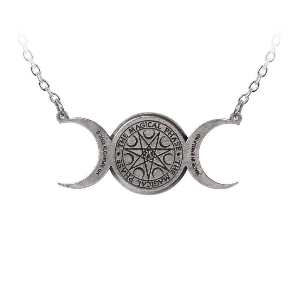 Nápadný náhrdelník ve tvaru trojitého měsíce, osazený gravírovaným zrcadlovým motivem Elfí hvězdy a planetárních symbolů.