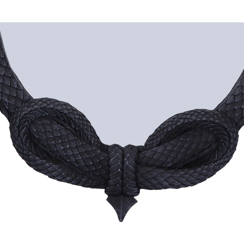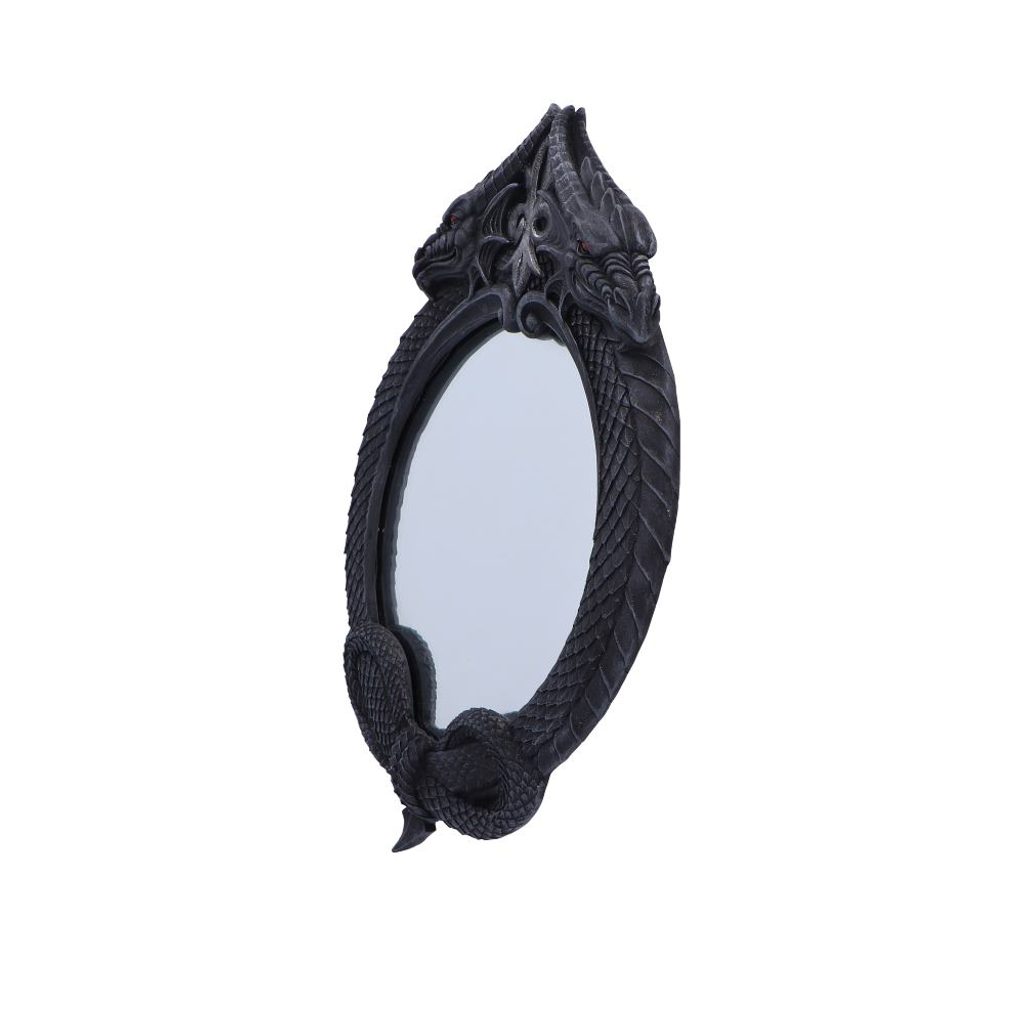 Odhalte dotek prastaré temnoty s The Reflector, výrazným gotickým dračím zrcadlem, které promění každý prostor v svět temné fantasy. Tento působivý kus má uprostřed zrcadlovou plochu, kterou obklopují dva detailně vyřezávaní draci. Jejich šupinatá těla se proplétají a hlavy směřují ven, což dodává stěně temnou eleganci. Dračí ocasy se stáčejí a společně vytvářejí uzavřený, výrazný rám.