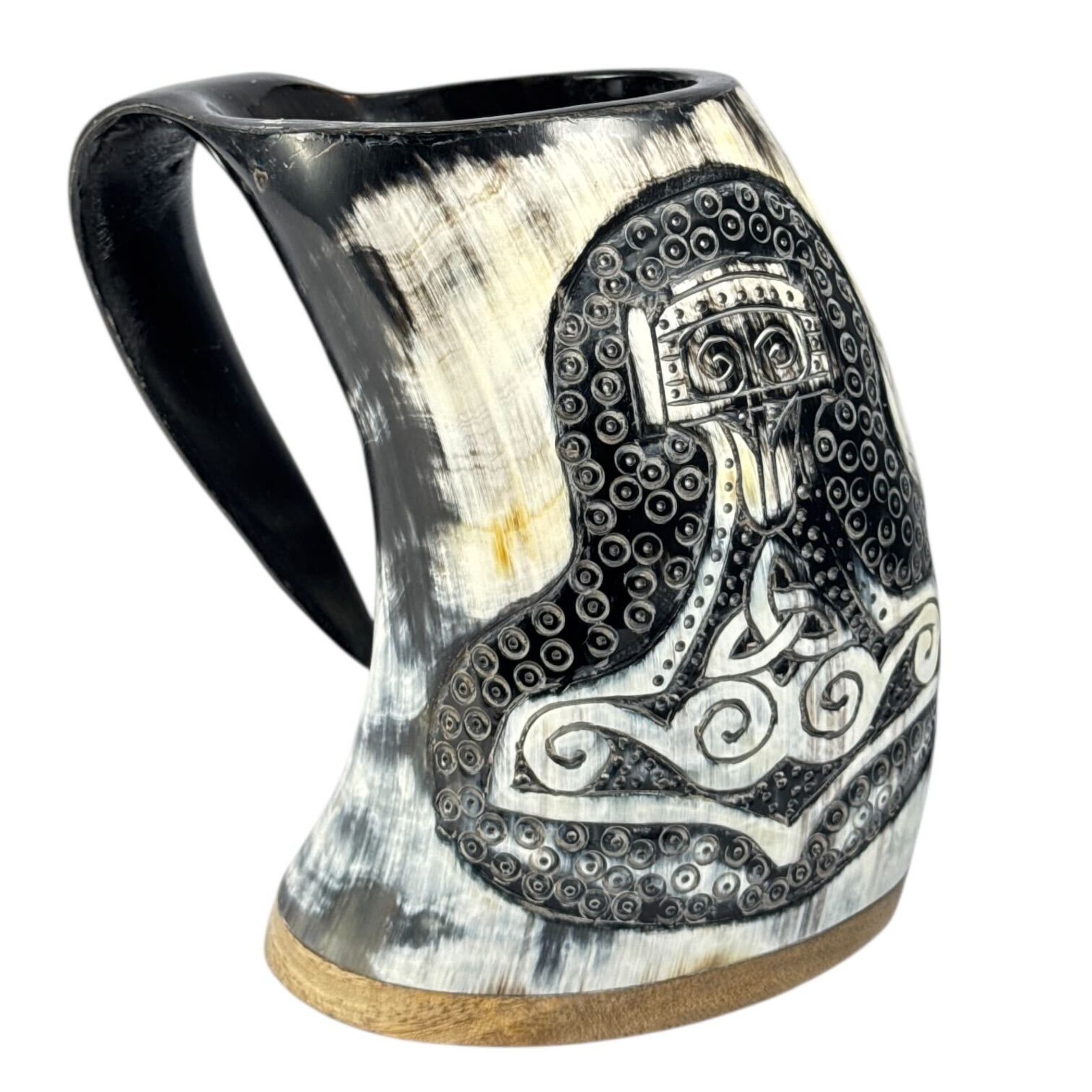 Tento mistrovsky zpracovaný vikingský pohár z pravé rohoviny představuje jedinečný výrobek, který v sobě spojuje sílu přírody a um řemeslné výroby. Každý pohár je originál díky přirozené kresbě rohoviny a ručnímu vyrytí složitých motivů inspirovaných severskou mytologií. Dominantou je bohatě zdobený reliéf připomínající Thorovo kladivo Mjölnir, symbol ochrany, síly a božské moci, jehož detailní vzory doslova vystupují z povrchu.