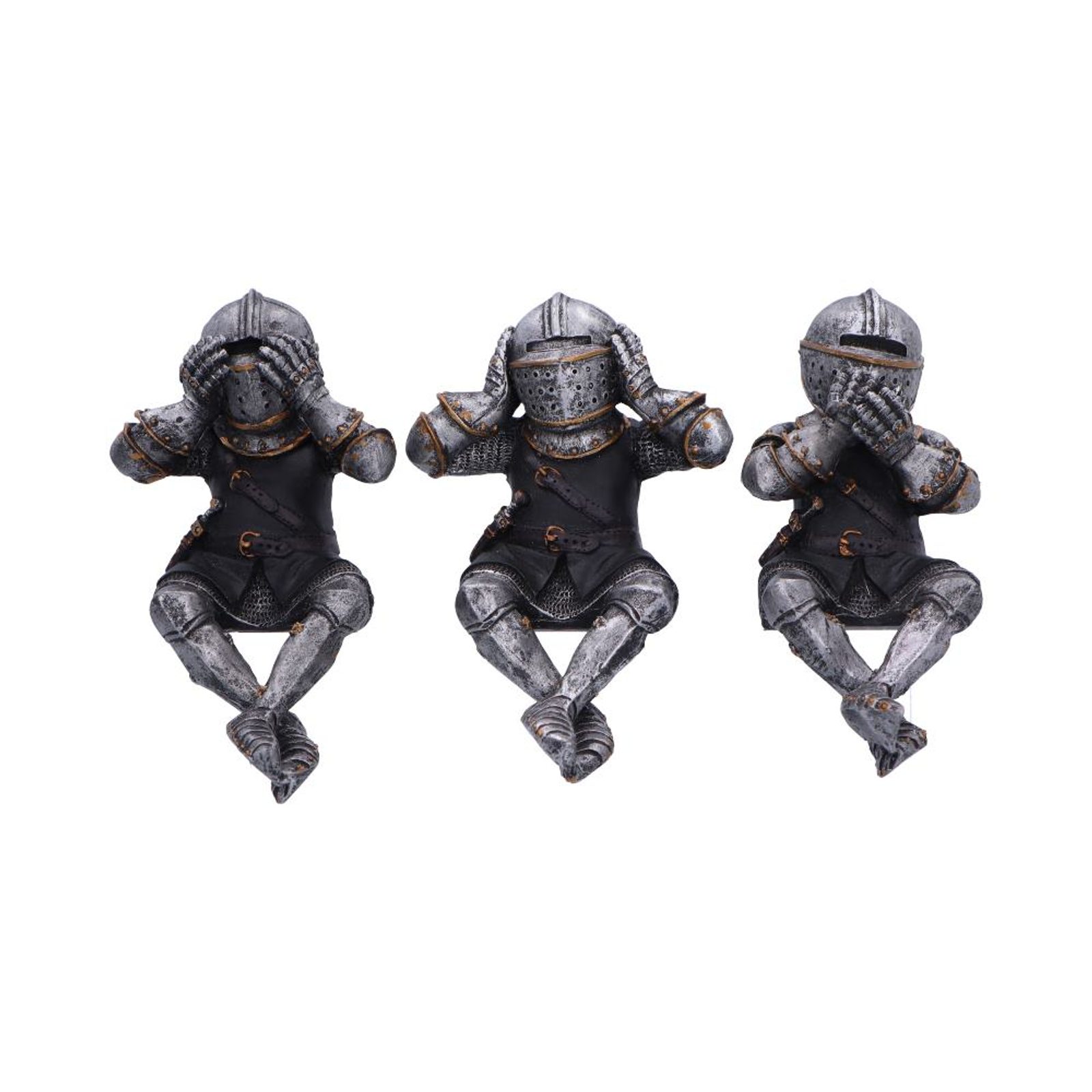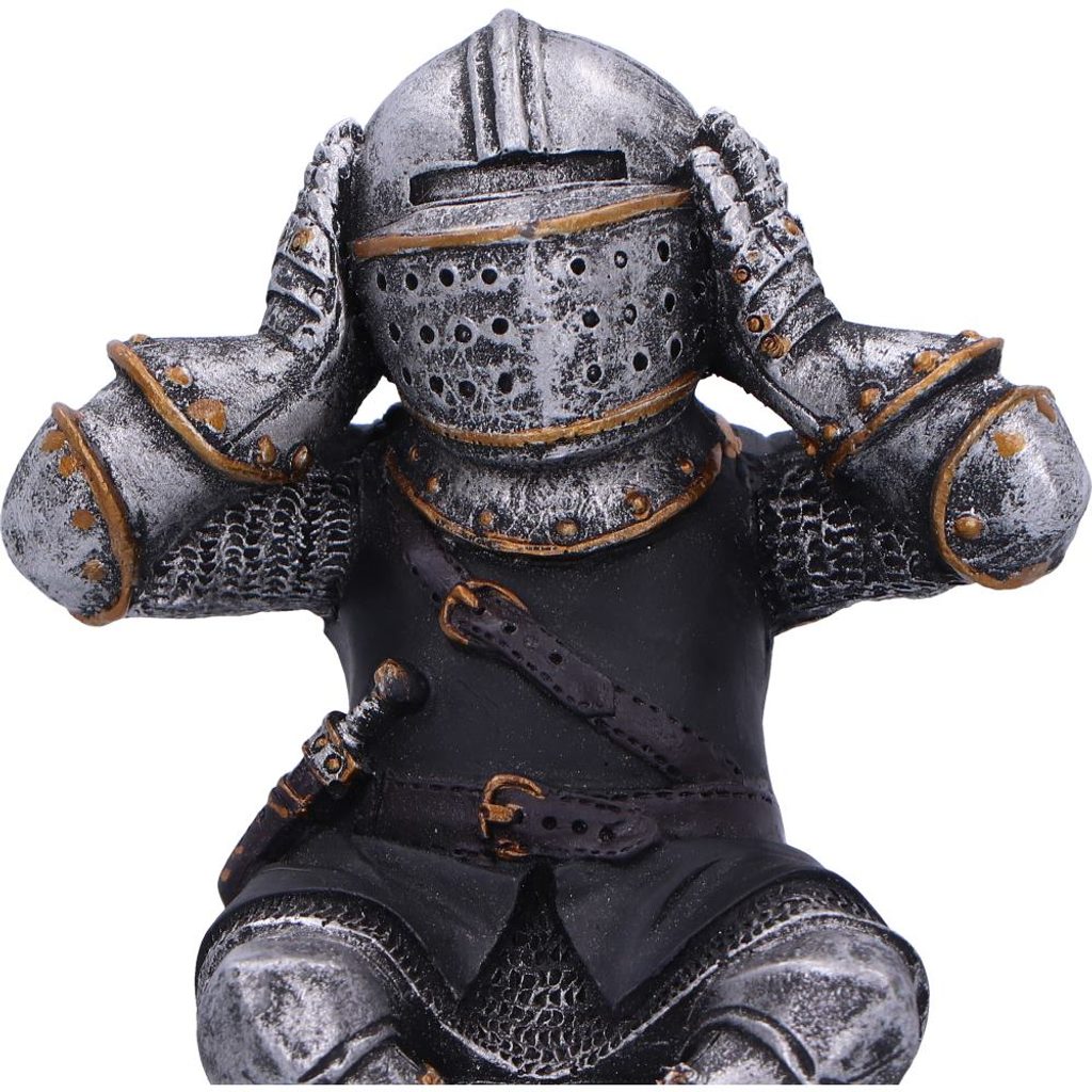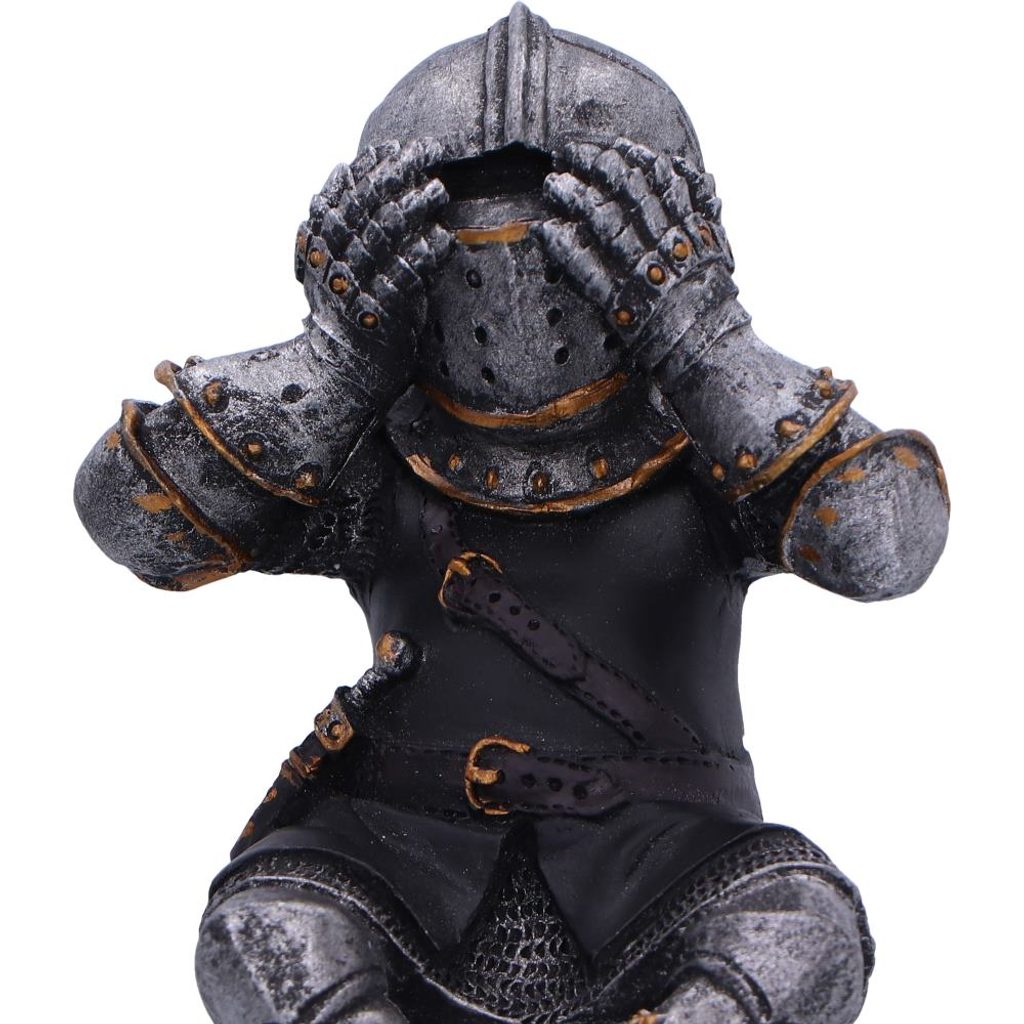 Vydejte se na cestu středověkým kouzlem s našimi Třemi rytíři, z prémiové kolekce, 11cm figurkami, které do vaší výzdoby přinesou rytířství a moudrost. Tito rytíři jsou vyrobeni z vysoce kvalitní pryskyřice a jsou vyzdobeni v plné zbroji, včetně výrazné helmy Bascinet, která předvádí pečlivou pozornost k detailu. Každý rytíř sedí se zkříženýma nohama vedle sebe a ztělesňuje přísloví „Nevidíte žádné zlo, neslyšte žádné zlo, nemluvte zlo“ a dodává vašemu prostoru nádech středověkého rozmaru. Brnění je dovedně natřeno stříbrnou barvou s opulentními zlatými akcenty, které umocňují královskou estetiku. Perfektní pro ty, kteří oceňují středověkou historii a rozmarnou symboliku, tyto police na sezení vnesou do každého prostředí atmosféru galantnosti. Prozkoumejte naši rozmanitou škálu dárkového zboží se středověkou tématikou, každý kus je vytvořen tak, aby vás přenesl do minulé éry rytířů a ušlechtilých ideálů.