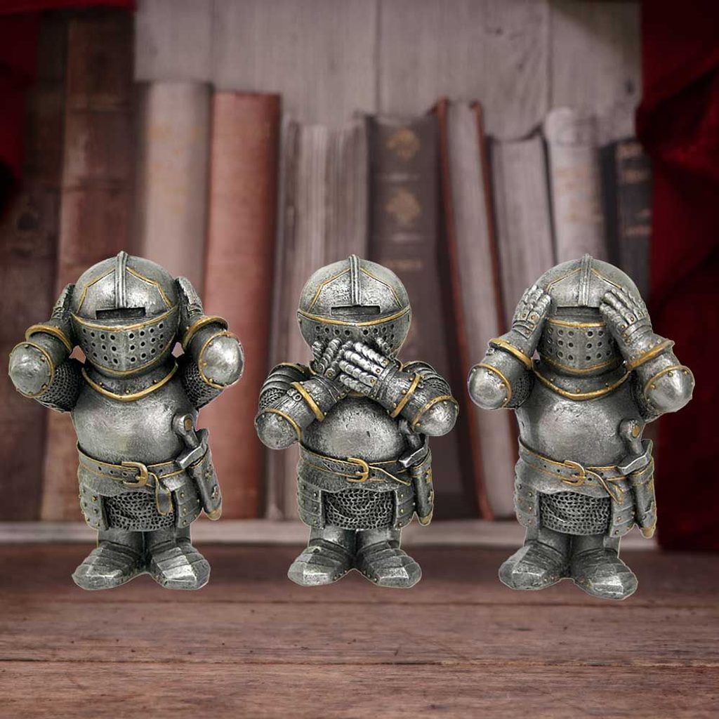 Figurka od značky Nemesis Now představuje trojici rytířů v plné zbroji, inspirovanou známým příslovím „Nevidím zlo, neslyším zlo, nemluvím zlo“.