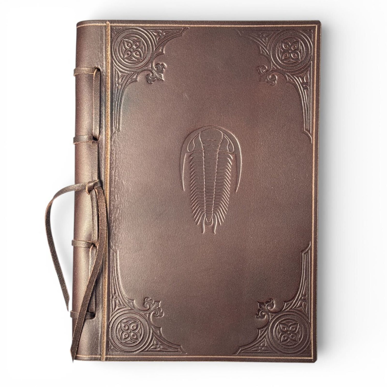 Uprostřed koženého obalu z kvalitní kůže je vytlačen trilobit, rohy obalu jsou ozdobeny originálními raznicemi z období secese, zhruba 100 staré.