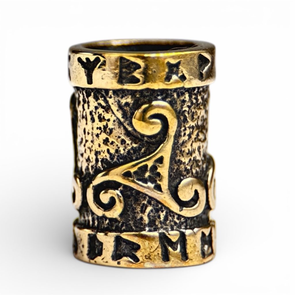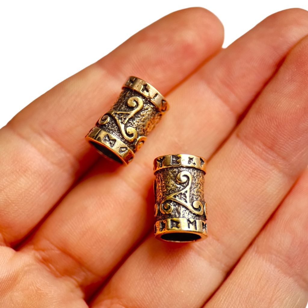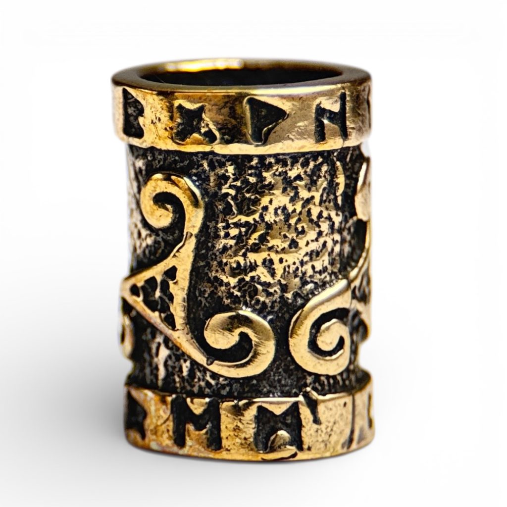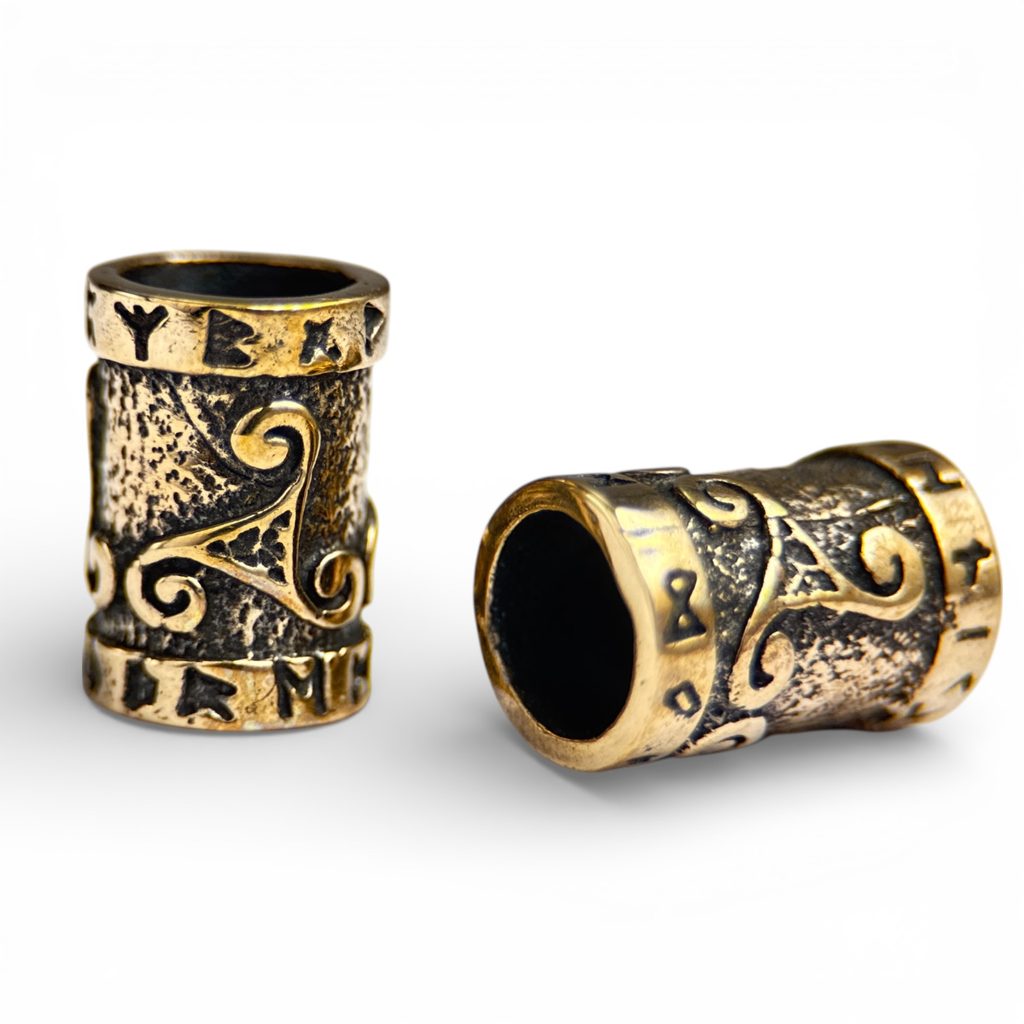Bronzový korálek nejen do vousů zdobený triskelionem a runami.