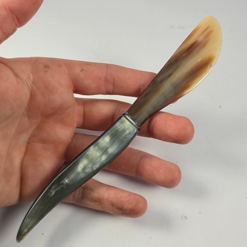 Tupý nůž vyrobený z kravského rohu. Celková délka: 18,5 cm.
