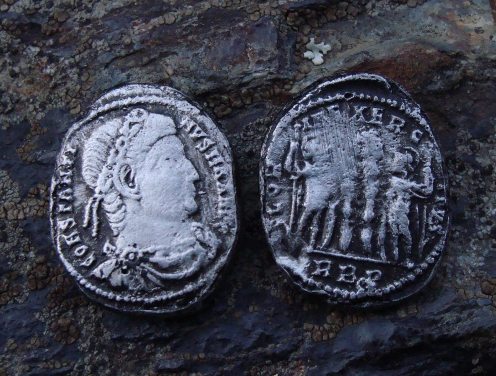 CONSTINVS (306 - 337), replika římské mince. Odlito z cínu, opatinováno. Velikost cca 1,5 - 1,9 cm.