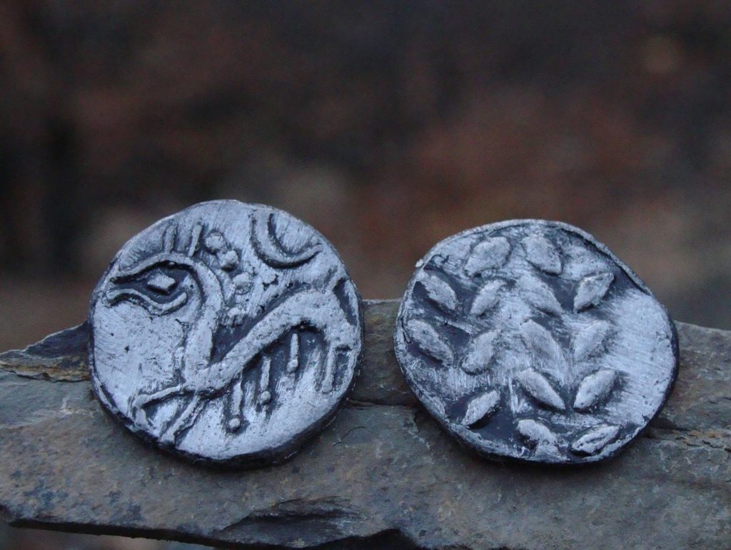 Replika keltské mince. Odlito z cínu, opatinováno. Velikost cca 2,2 cm v průměru.
