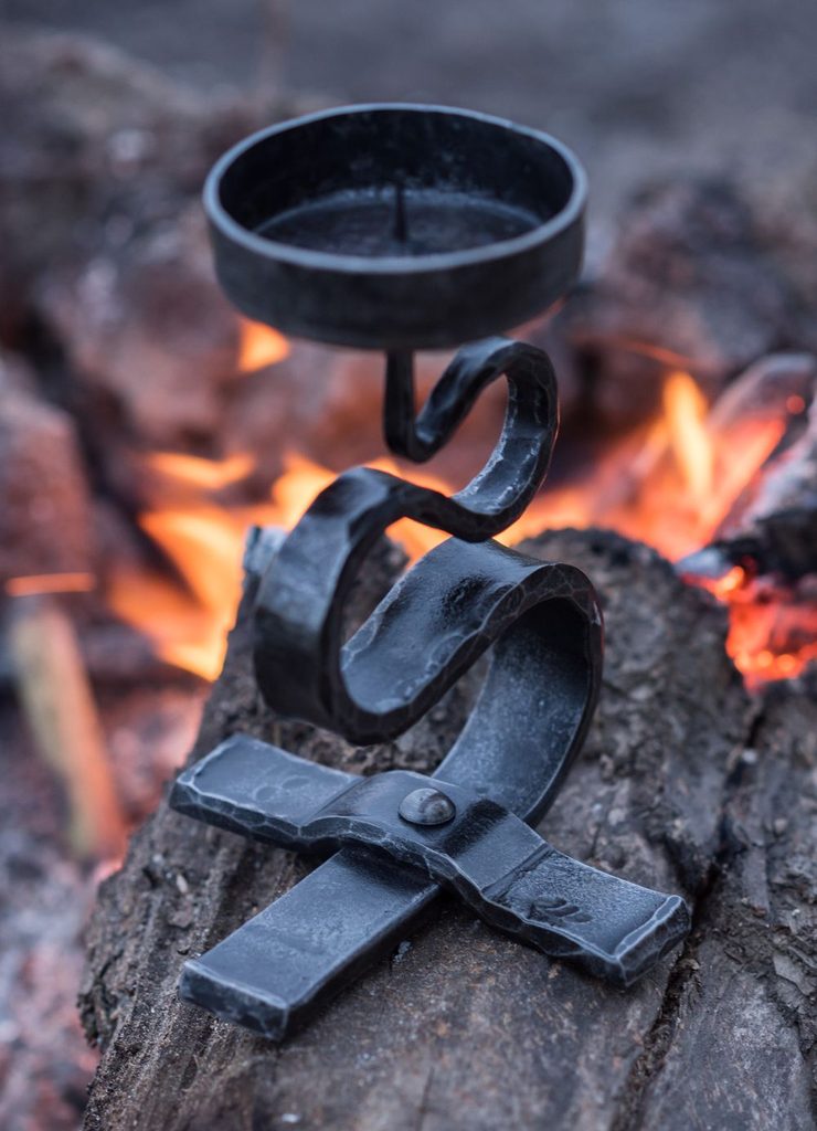 Kovaný svícen k Vašemu krbu, jako výzdoba historických interiérů či restaurací. Výška 21 cm, průměr podstavce pro svíčku 17 cm.