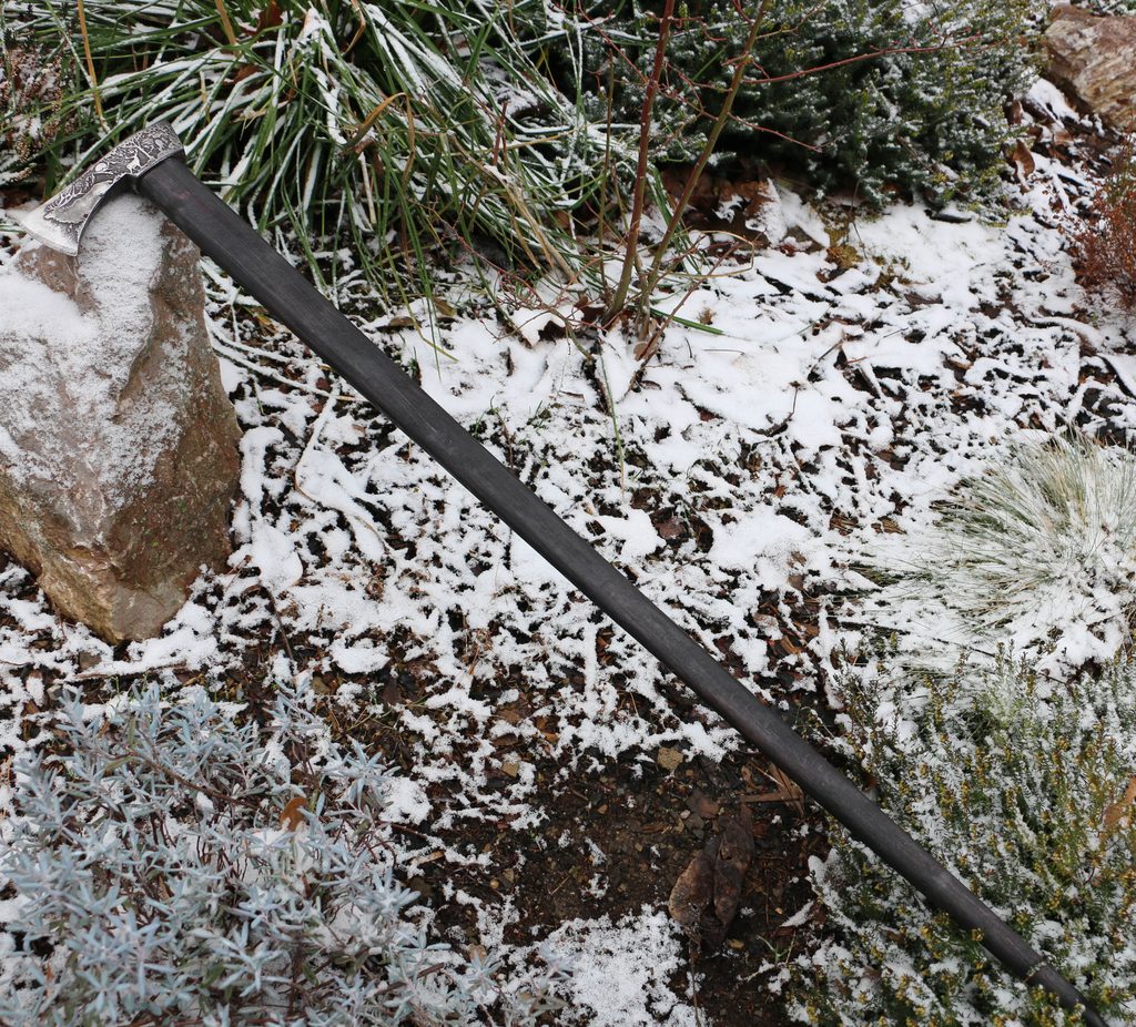 Kovaná z jednoho kusu. Ozdobená cínem. Výrobek české kovárny Wulflund.