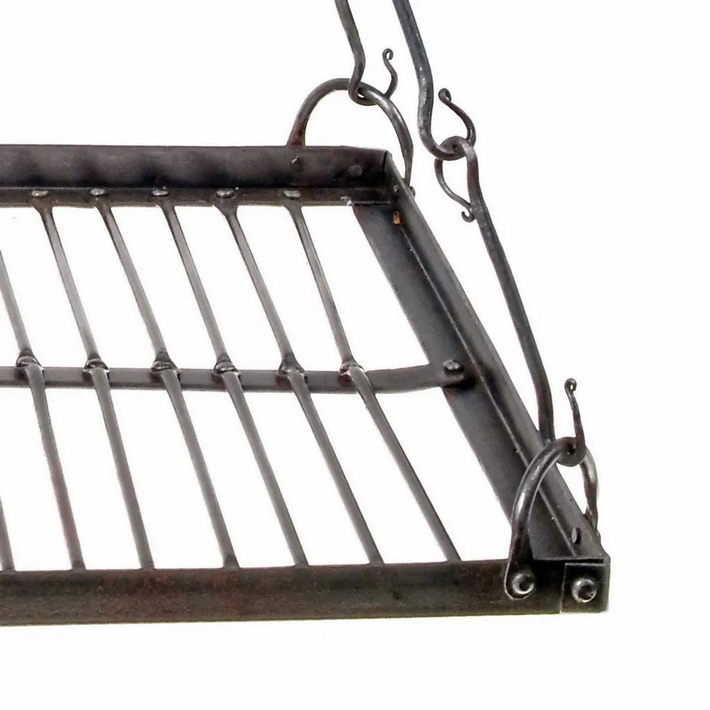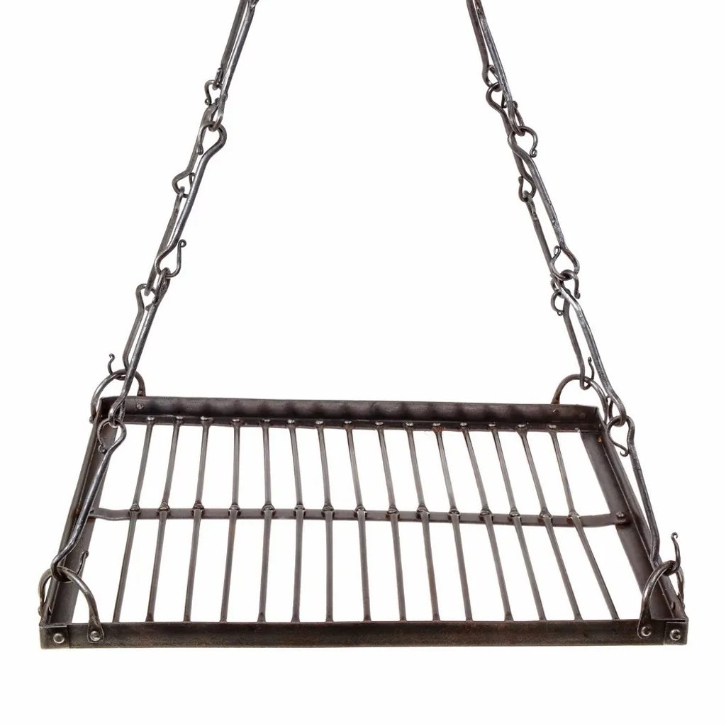Mřížka grilu je ručně kovaná a má typický hrubý povrch po kování, charakteristický pro historické železné výrobky. Rozměry jsou přibližně 45 × 45 cm.
