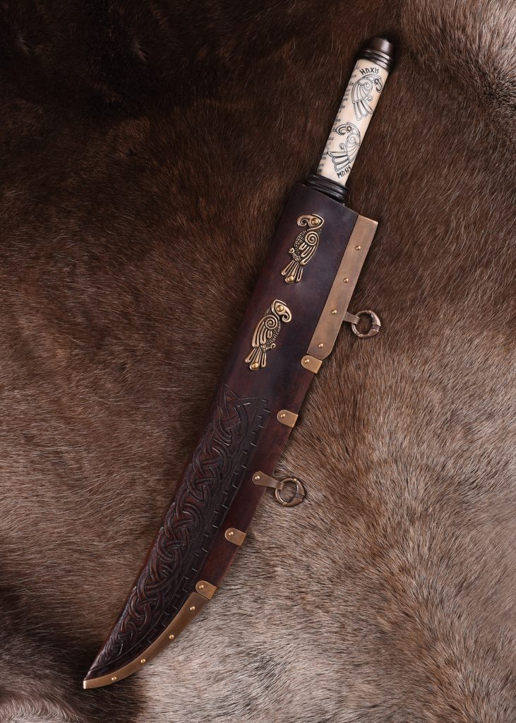 Dlouhý vikinský seax je dodáván s krásnou pochvou z pevné, rostlinně činěné kůže, zdobenou ručně vytlačovaným ornamentem v severském stylu a doplněnou patinovanými mosaznými prvky, včetně dvou závěsných kroužků. Motiv dvou havranů z rukojeti se opakuje i na jedné straně pochvy. Každý havran je odlitek z mosazi a je připevněn nýty.