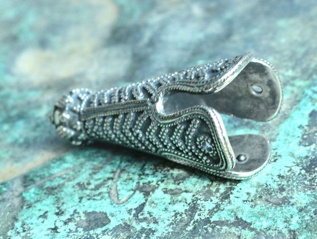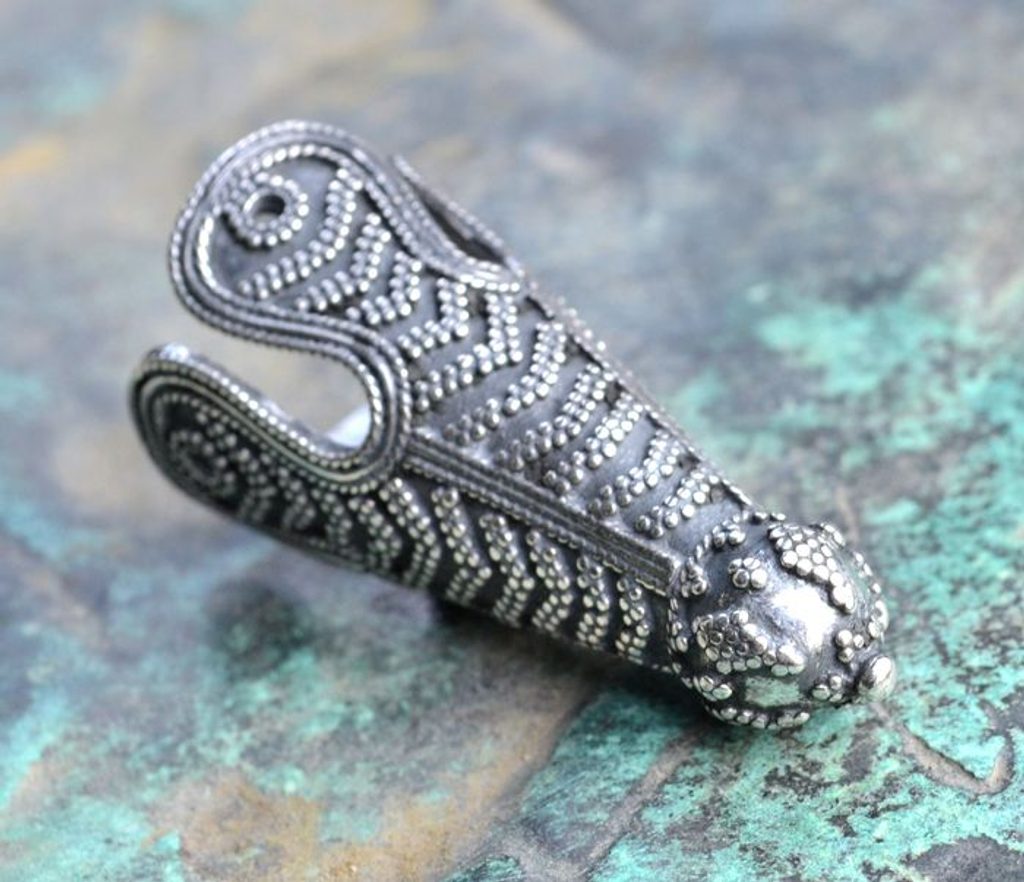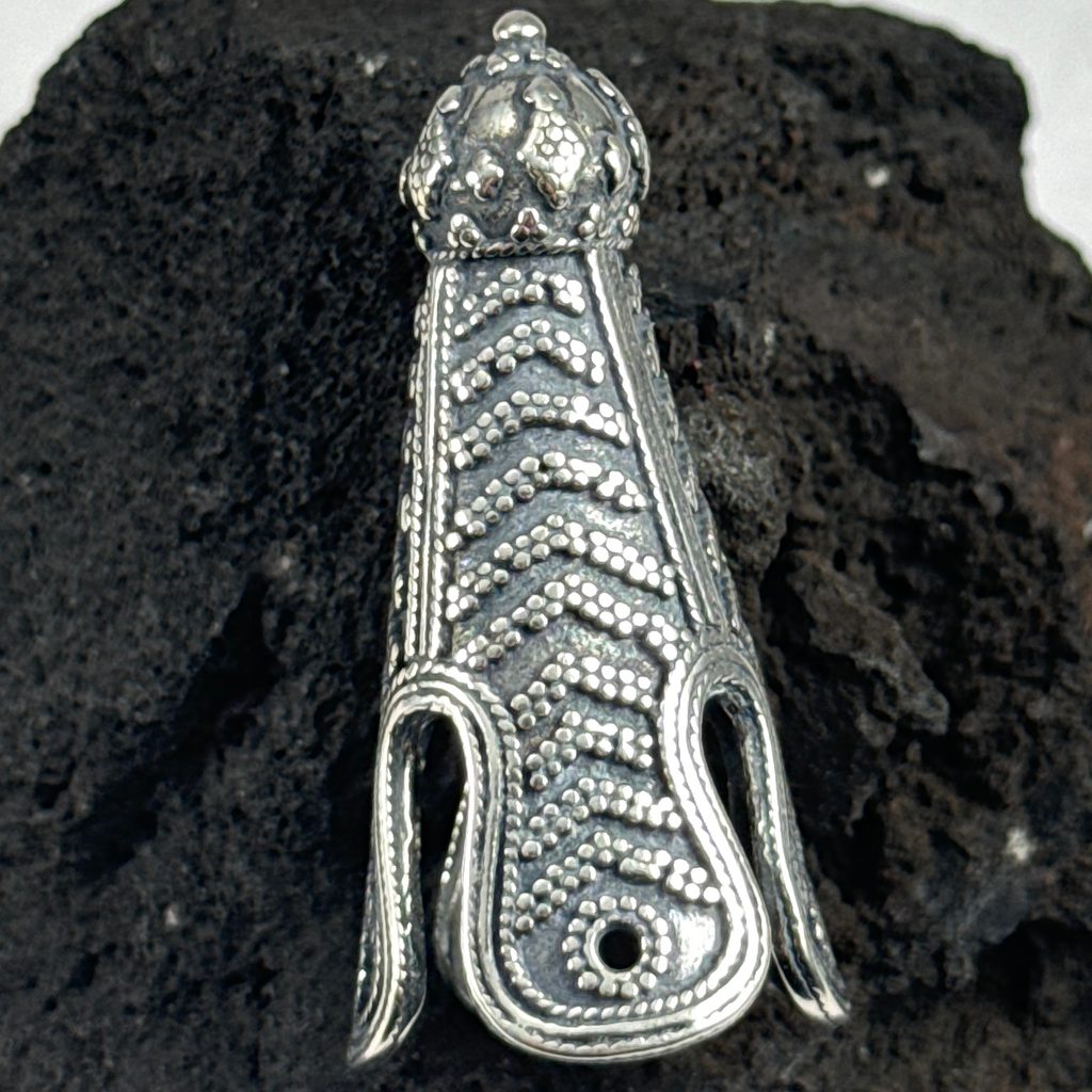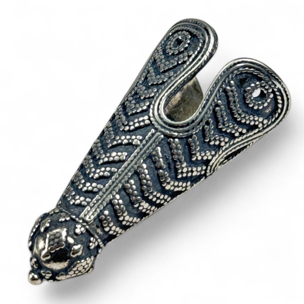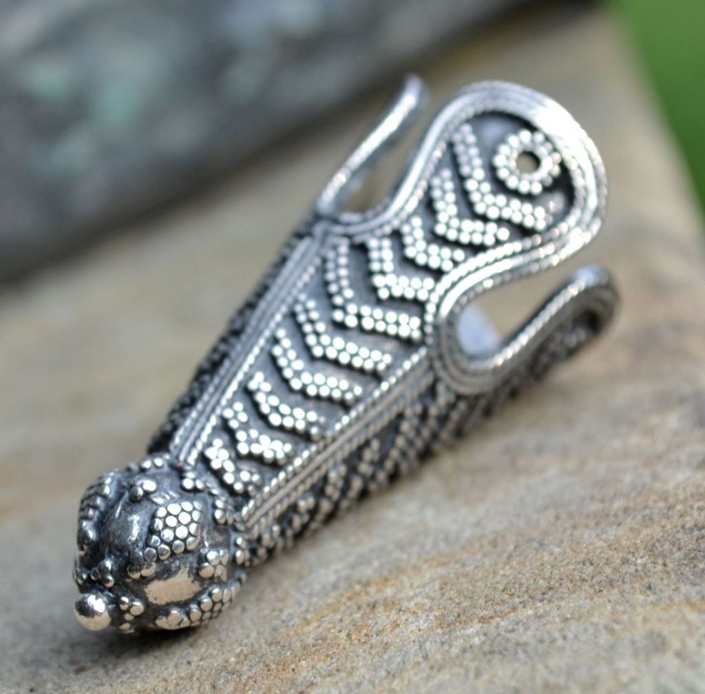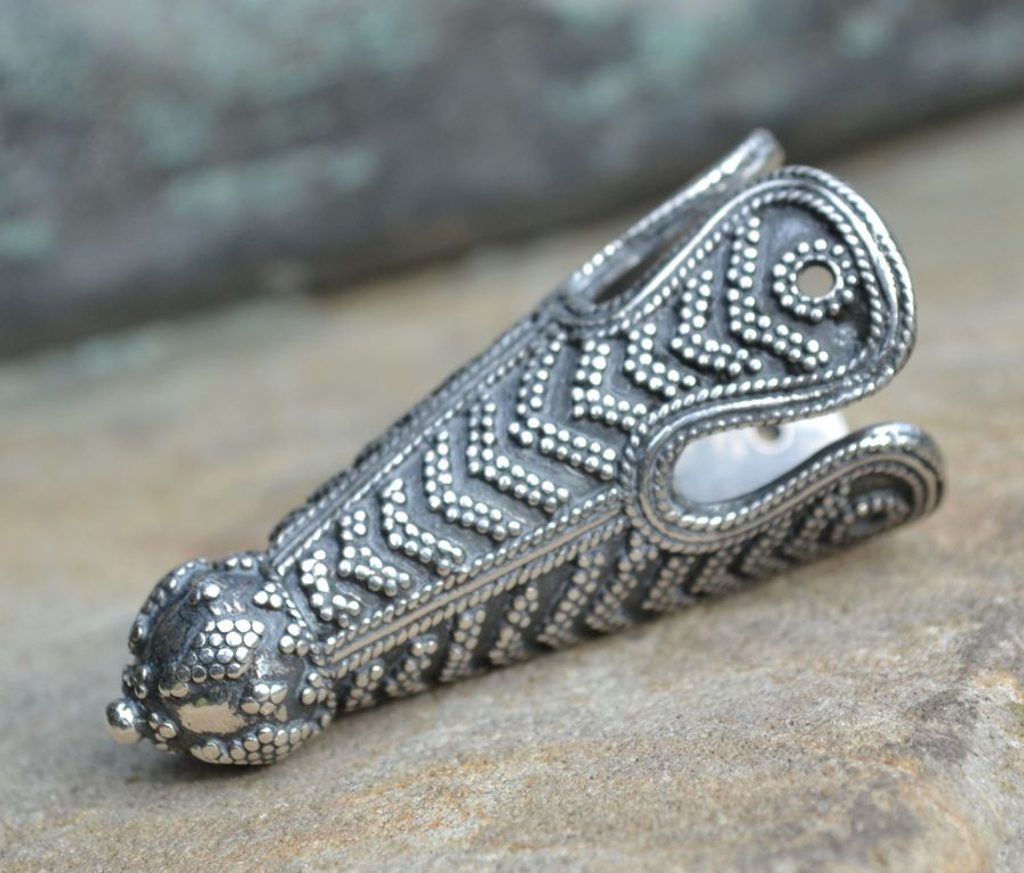 Reprodukce vikinské koncovky na čepici, která byla nalezena na Birce (Švédsko) v hrobech 581 a 644 z 10. století.