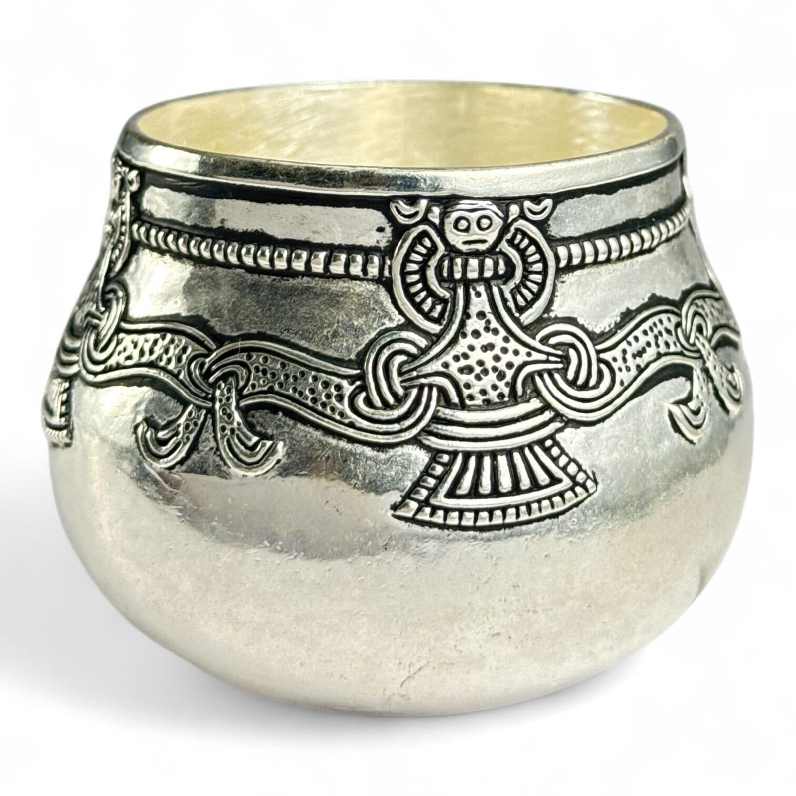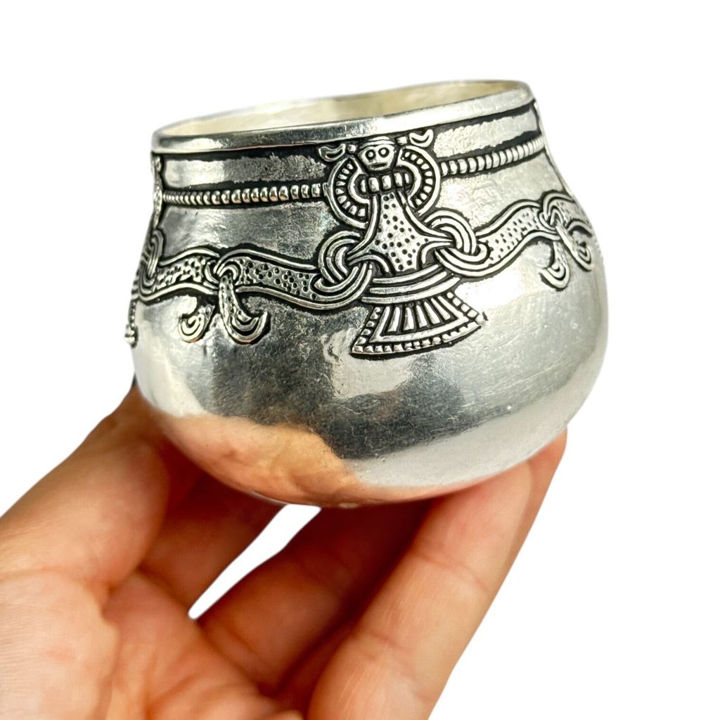 Původní vikingský pohár z Lejre byl vyroben z ryzího stříbra a zdoben niellovými (černými) výplněmi.