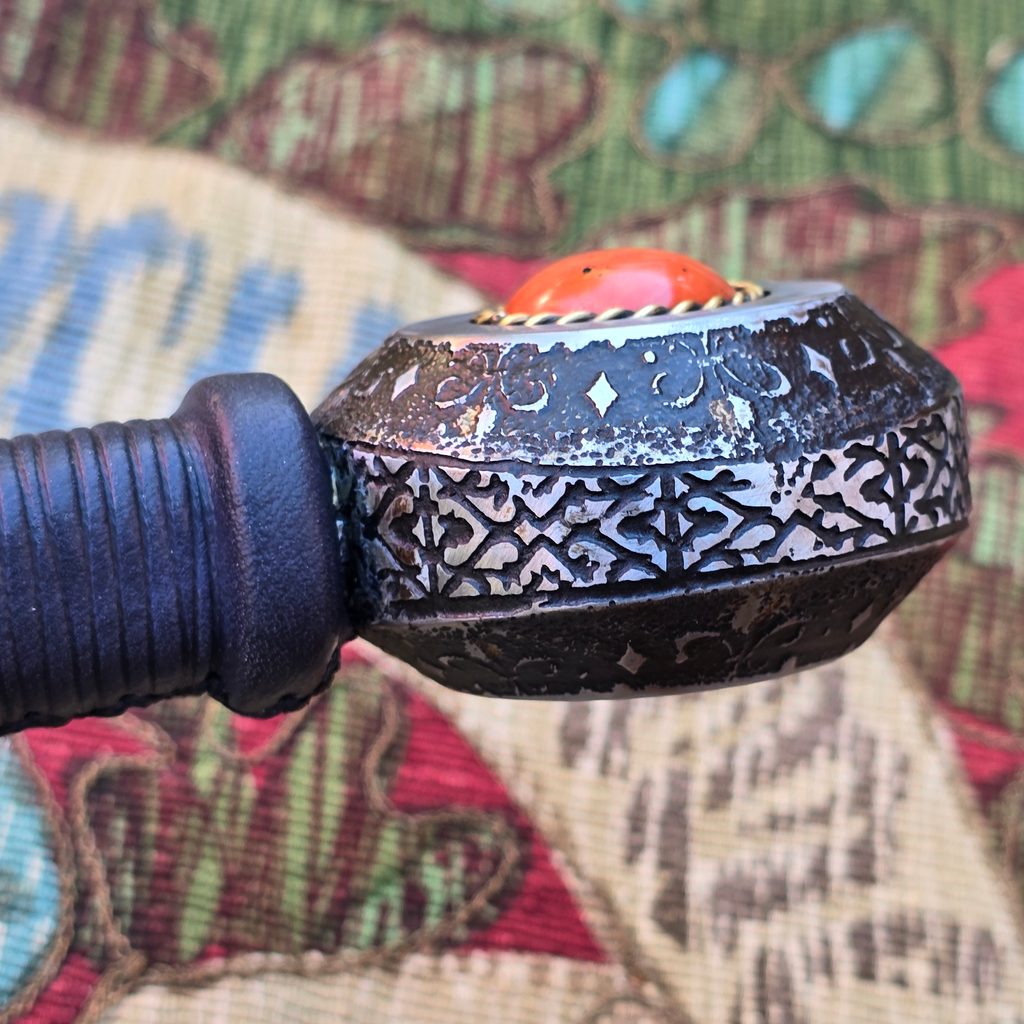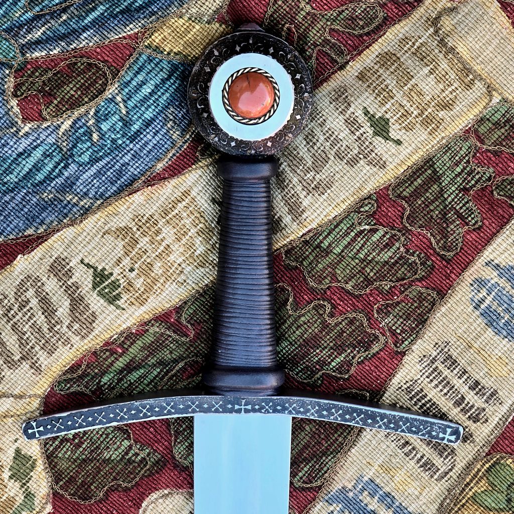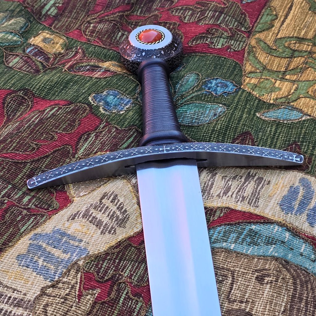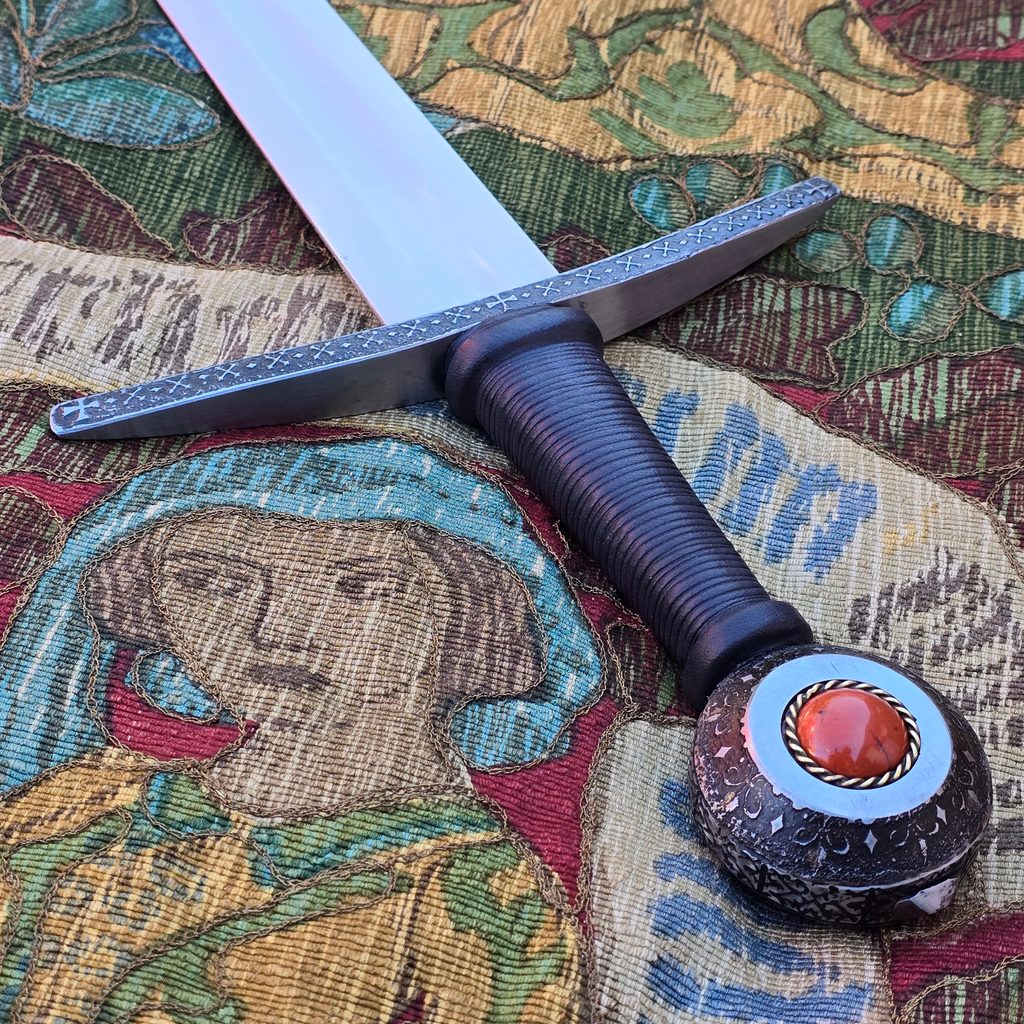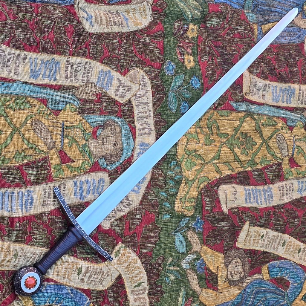 Jednoruční středověký meč z naší kovářské dílny. Konstrukčně i řemeslně velmi povedený meč v provedení full-tang. Celá čepel je vyrobena v jednom kuse, skrz hlavici meče, kde je čepel zanýtována. V tomto tupém provedení je meč určen ke scénickému šermu.