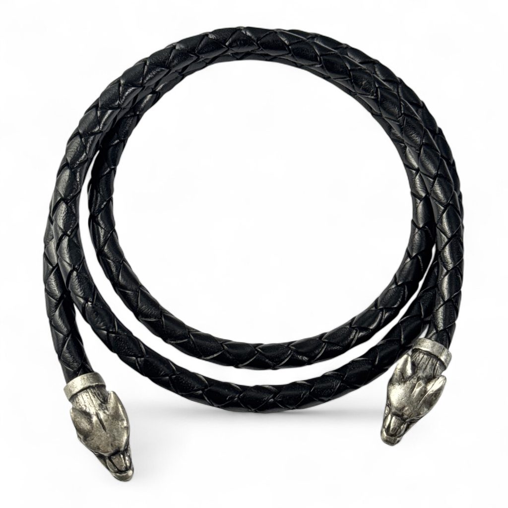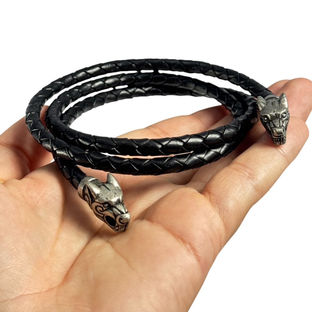 Kožený pletený náhrdelník zakončený vlčími hlavami (inspirace: vlčí kříž z lokality Fossi, Island - Vikingové). Fenrir je nejstarší syn boha Lokiho a obryně Angrbody. Bohové Fenrira spoutali, jeho osudem však je růst tak dlouho, dokud pouta nepovolí, a poté za Ragnaröku spolknout Ódina.