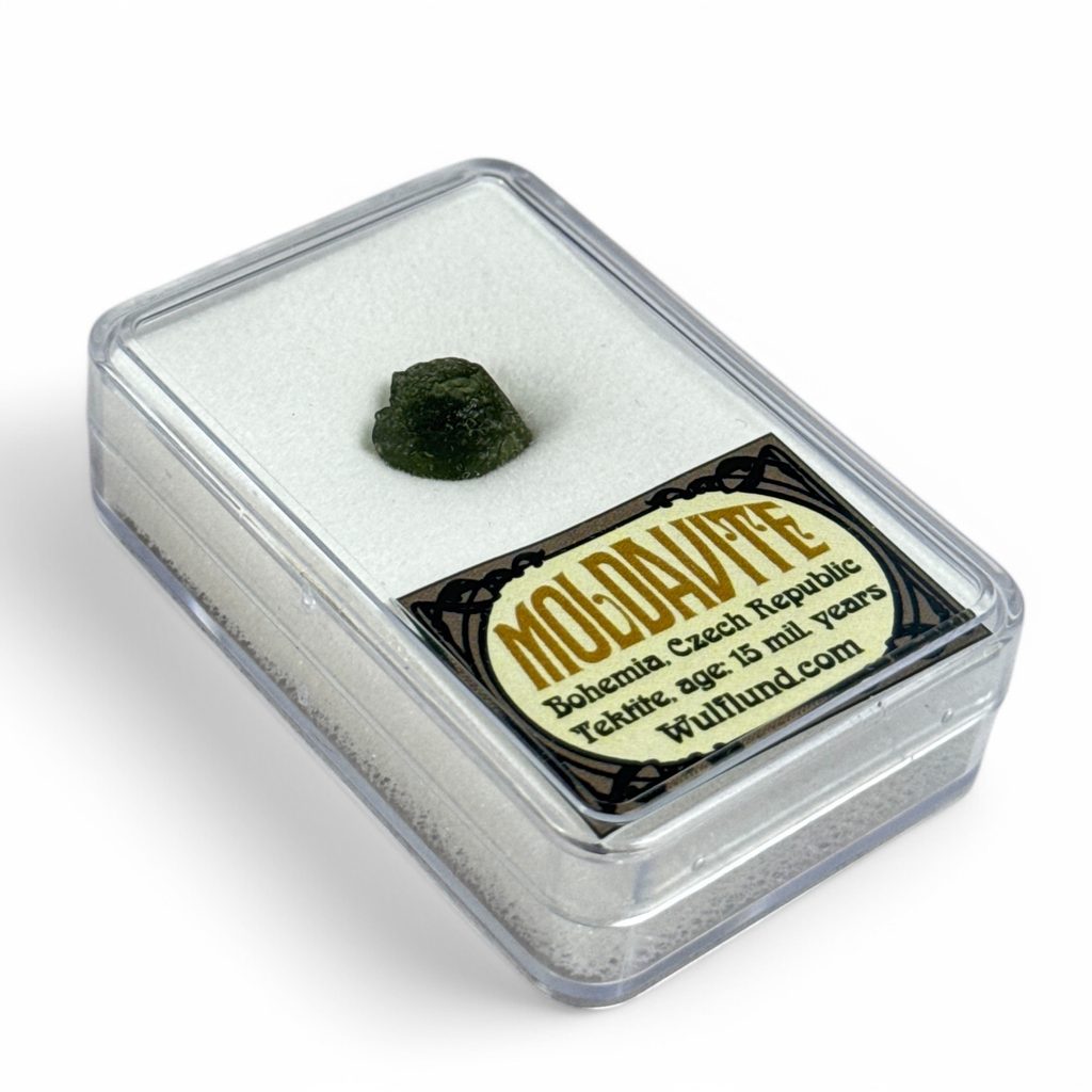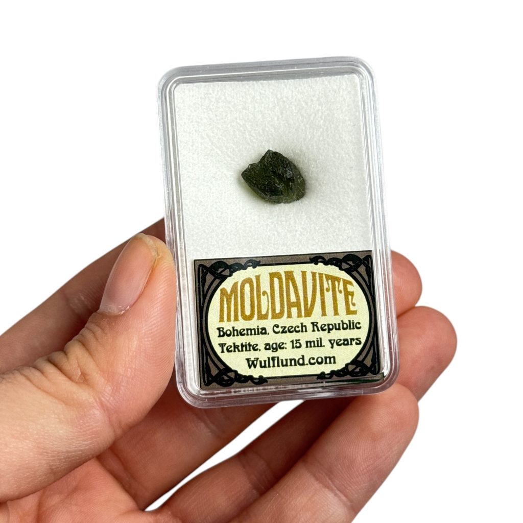 Obrázek je ilustrativní, každý kus je originál, liší se tvarem i odstínem zelené barvy. Kámen má přibližnou váhu 0,6 - 1g a je uložen v průhledné krabičce s popisem původu. Povrch nese typickou jamkovitou strukturu, která vznikla při prudkém zchladnutí taveniny po dopadu meteoritu. Vltavín pochází z českých nalezišť, kde se těží v omezeném množství a je vyhledávaným suvenýrem i sběratelským kouskem.