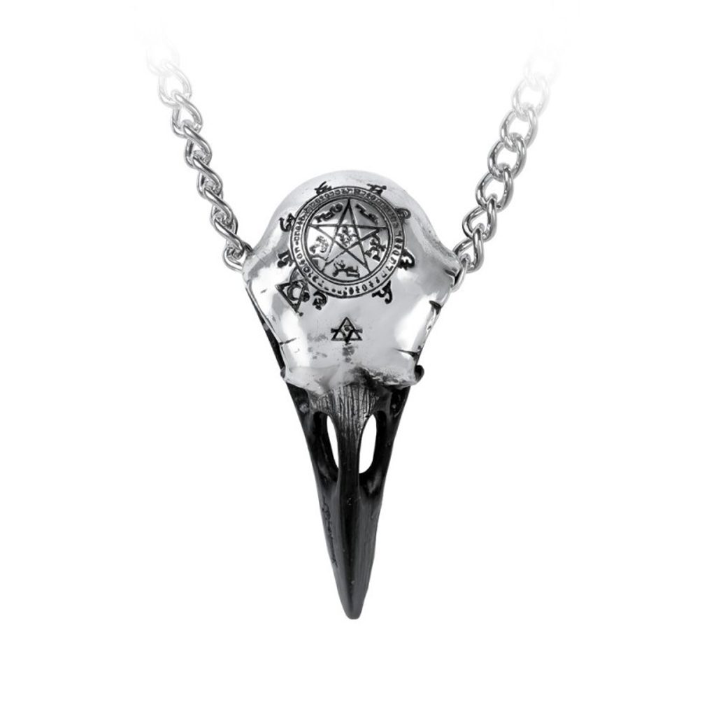 Přívěsek z jemného cínu zobrazuje stylizovanou ptačí lebku havrana s černě upraveným zobákem a rytinou ve formě hexu na temeni lebky.