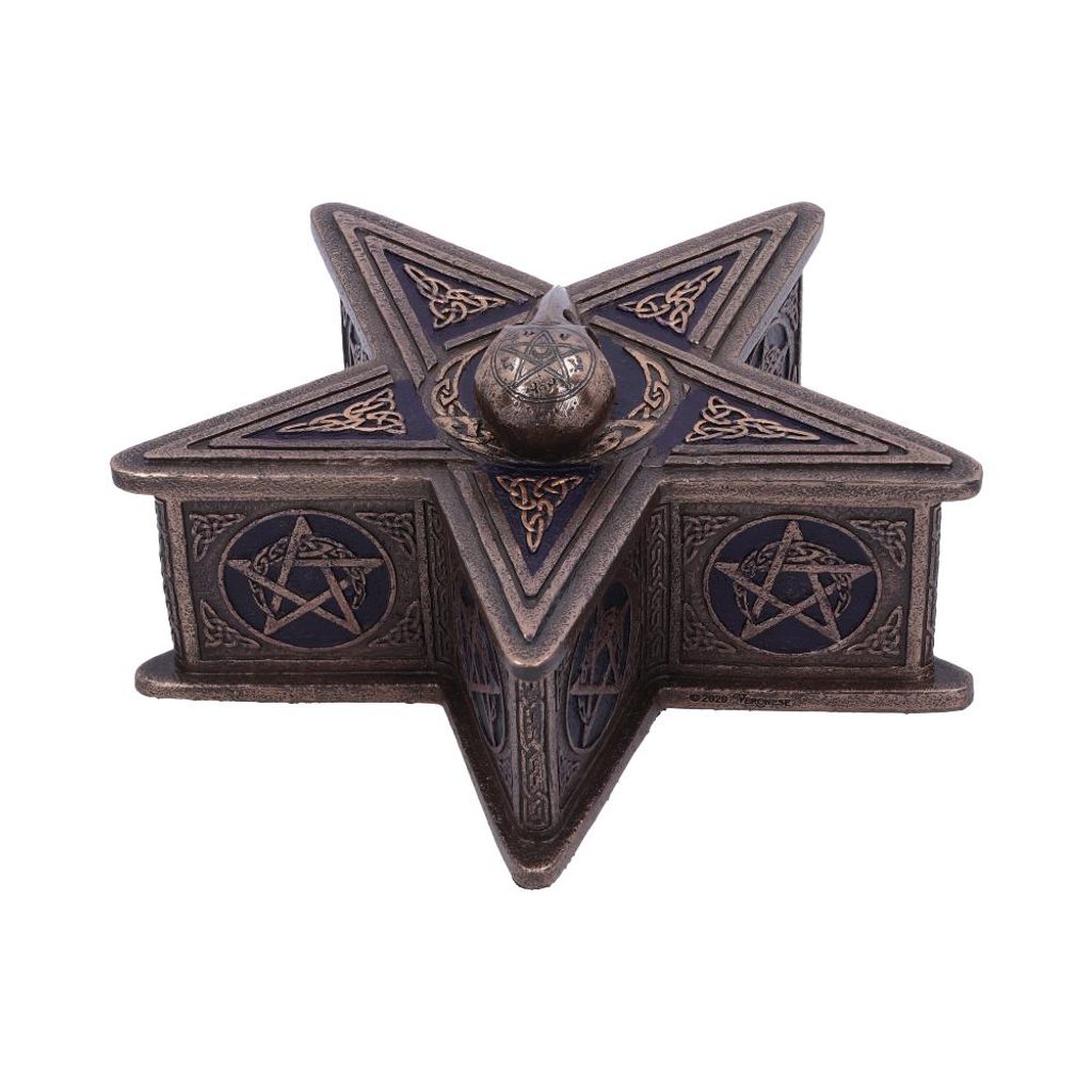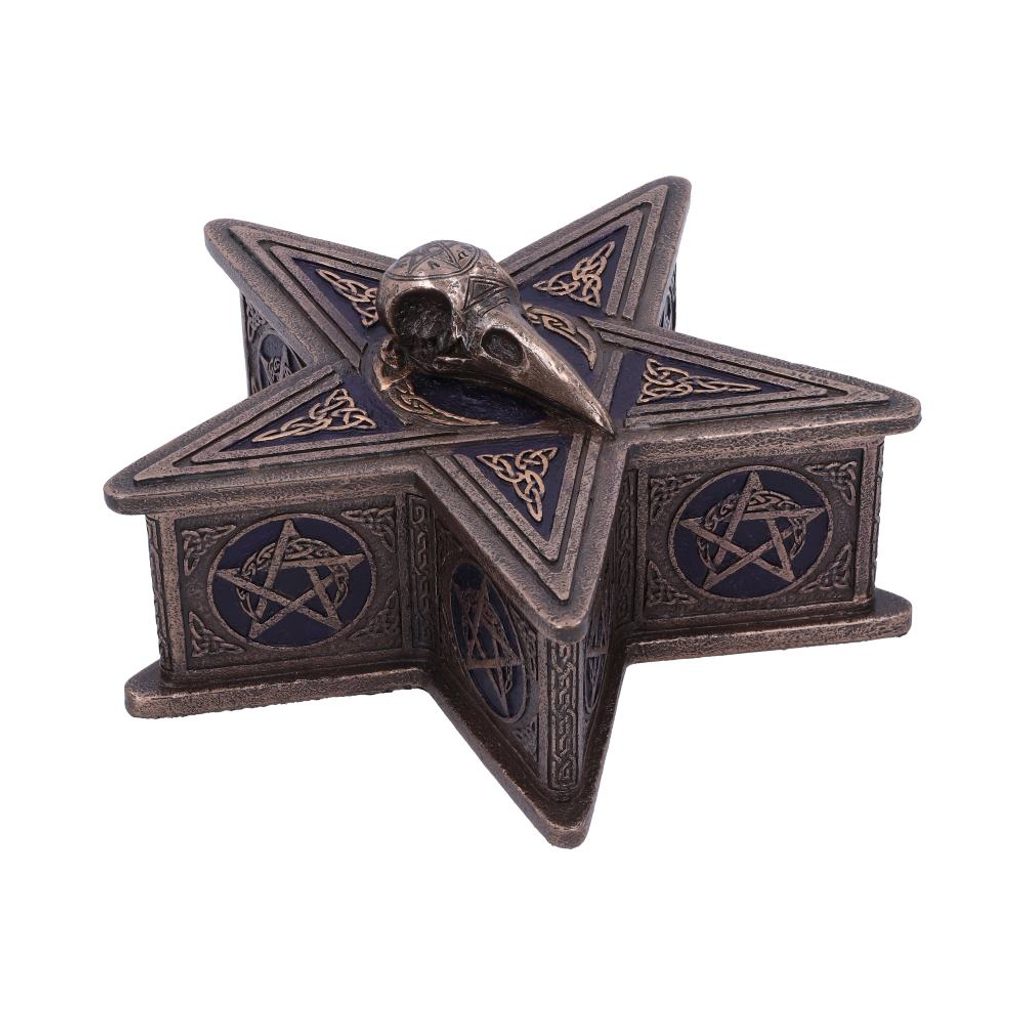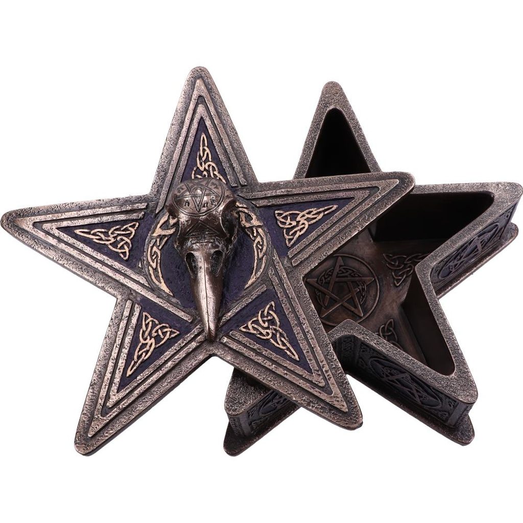 Tato krabička Pentagramu Raven Box je vytvarována do wiccanského pentagramu, který obsahuje různé čarodějnické symboly jak uvnitř, tak vně. Na víku krabice je umístěna lebka havrana, kterou lze zvednout a odhalit váš nejcennější majetek. Tato krabička je odlita do nejkvalitnější pryskyřice a teprve poté je odborně ručně malována a je dokonalým doplňkem každé gotické sbírky.