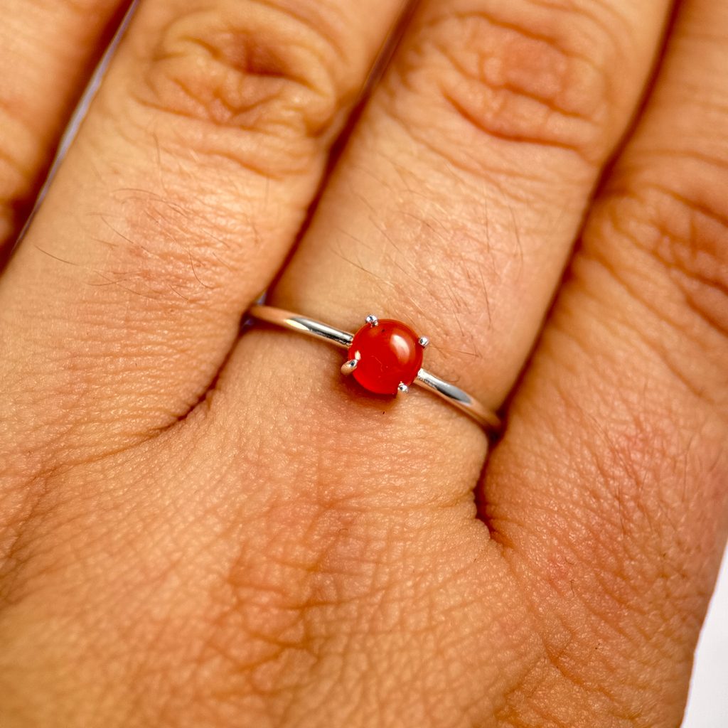 Elegantní a minimalistický prsten je osazen karneolem broušeným do kulatého kabošonu o průměru 5 mm. Zářivě oranžový kámen krásně vyniká v jemném hladkém provedení stříbra Ag 925/1000.