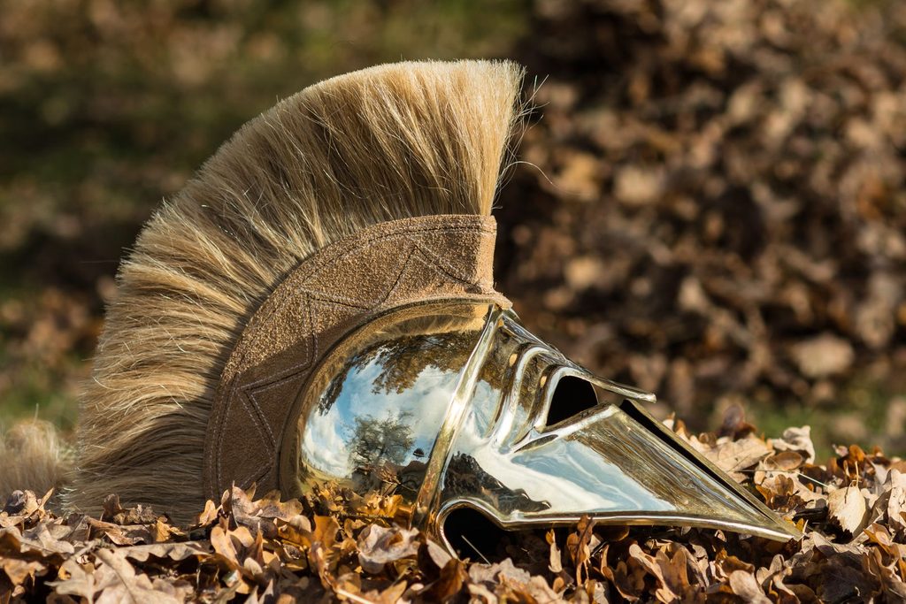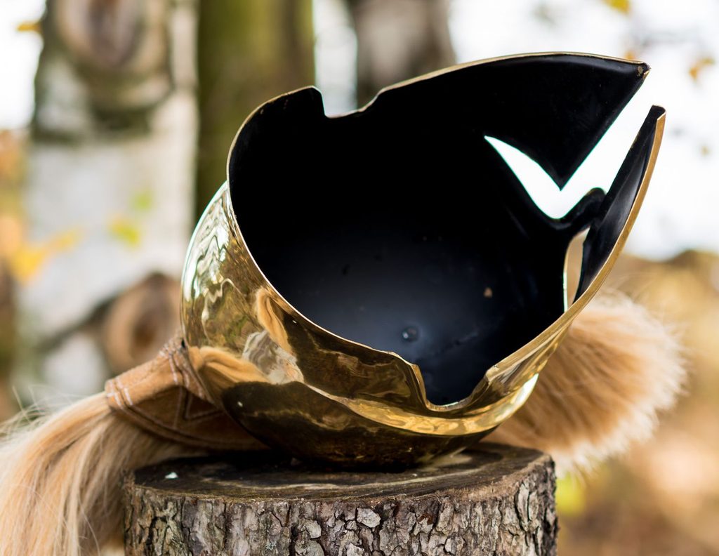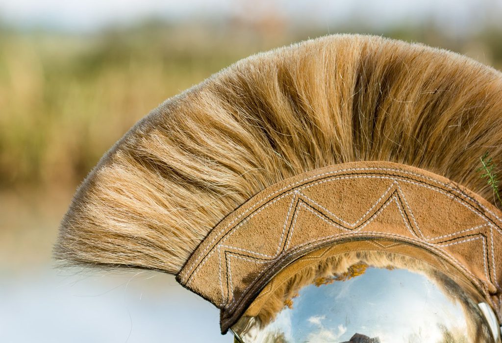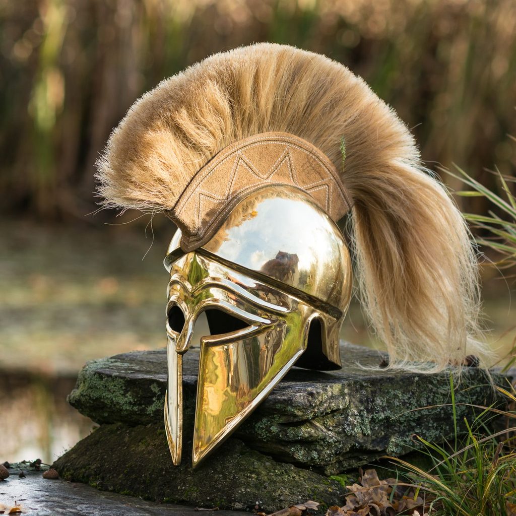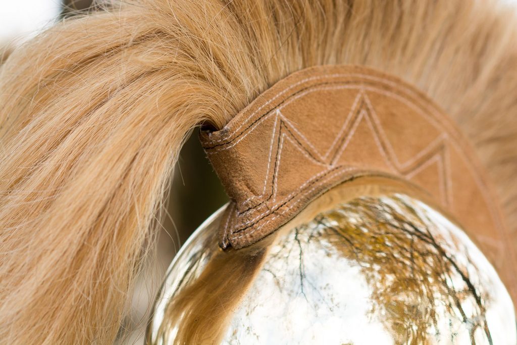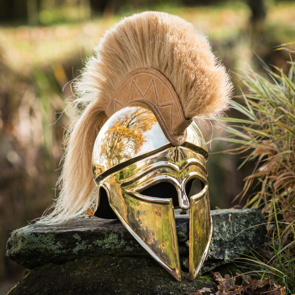 Typická korintská přilba s chocholem z koňských žíní. Přilba je vyrobena z mosazi a je vybavena nastavitelnou koženou vložkou a koženým řemínkem pod bradu.